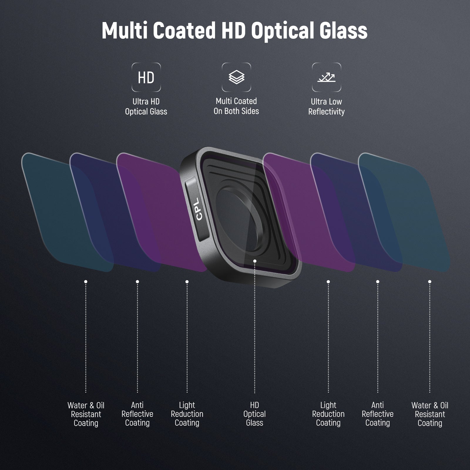 - Vidrio óptico HD con revestimiento múltiple : con tecnología de revestimiento premium de múltiples capas, el filtro polarizador reduce eficazmente el destello de la lente y evita el viñeteado, lo que garantiza claridad y detalle en el efecto de disparo. El vidrio óptico HD brinda una claridad, nitidez y precisión de color excepcionales. Ofrece alta transmisión de luz, reduce los reflejos y es duradero y fácil de limpiar, lo que garantiza resultados de alta calidad constante.