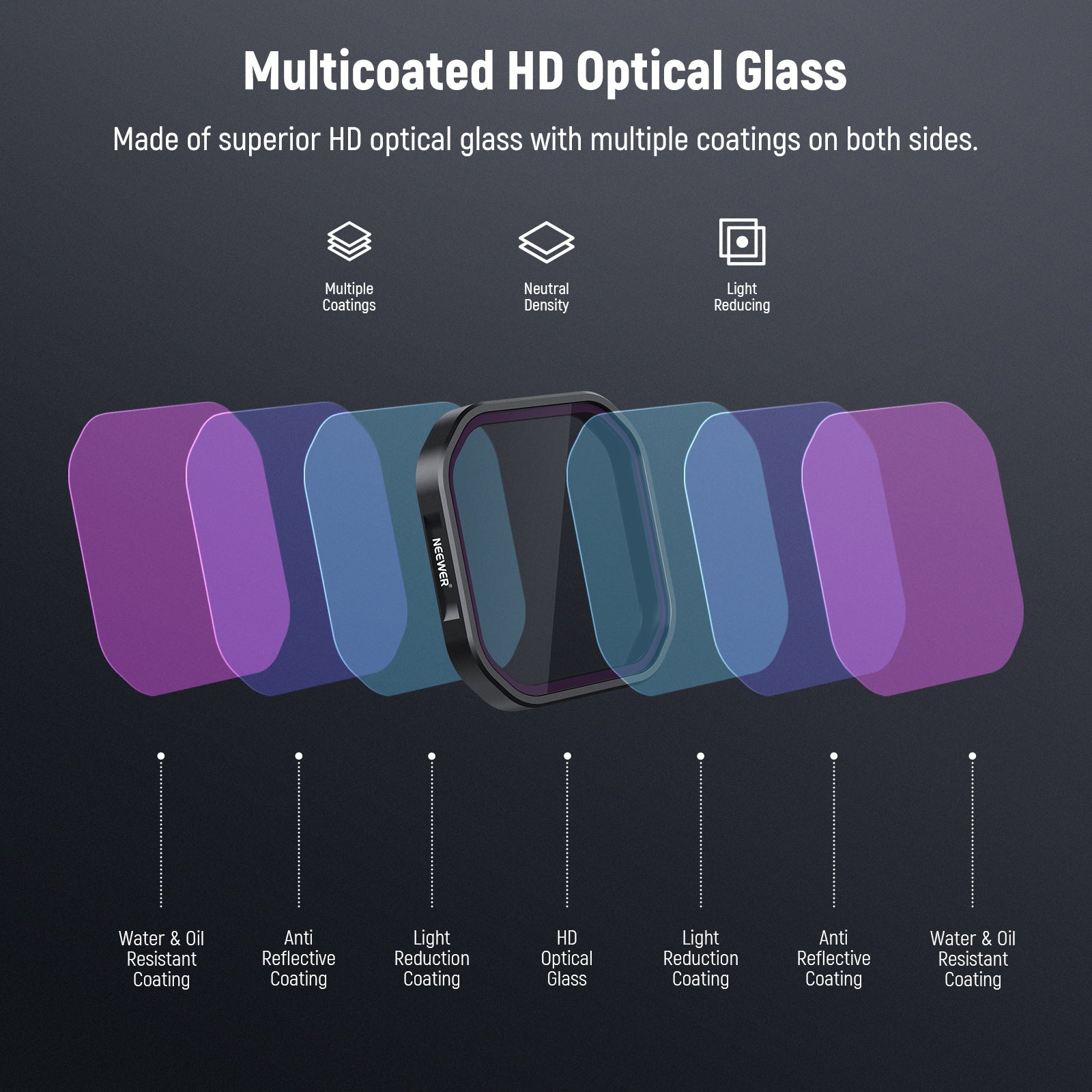 - Vidrio óptico HD multicapa : El vidrio óptico HD garantiza una alta claridad y una reproducción precisa del color. Los múltiples revestimientos en ambas caras del vidrio son resistentes al agua, huellas dactilares, manchas y arañazos, lo que facilita la limpieza de los filtros (incluye un paño de limpieza).