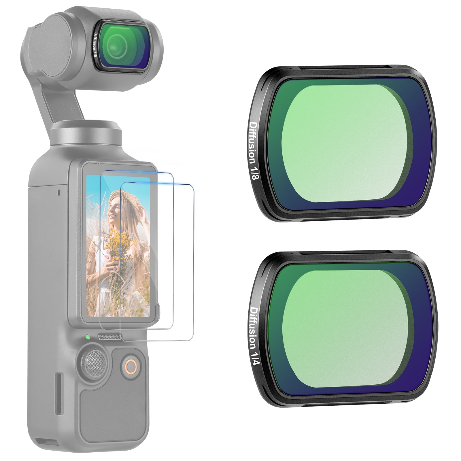 - Compatible con DJI Osmo Pocket 3 : este juego de filtros de difusión negros de 1/4 y 1/8 es compatible con DJI Osmo Pocket 3. Un cambio de juego para profesionales y entusiastas experimentados de cámaras con estabilizador de mano, cuenta con una fijación magnética instantánea y segura y un vidrio óptico HD para imágenes nítidas durante vlogs y disparos con cámara.