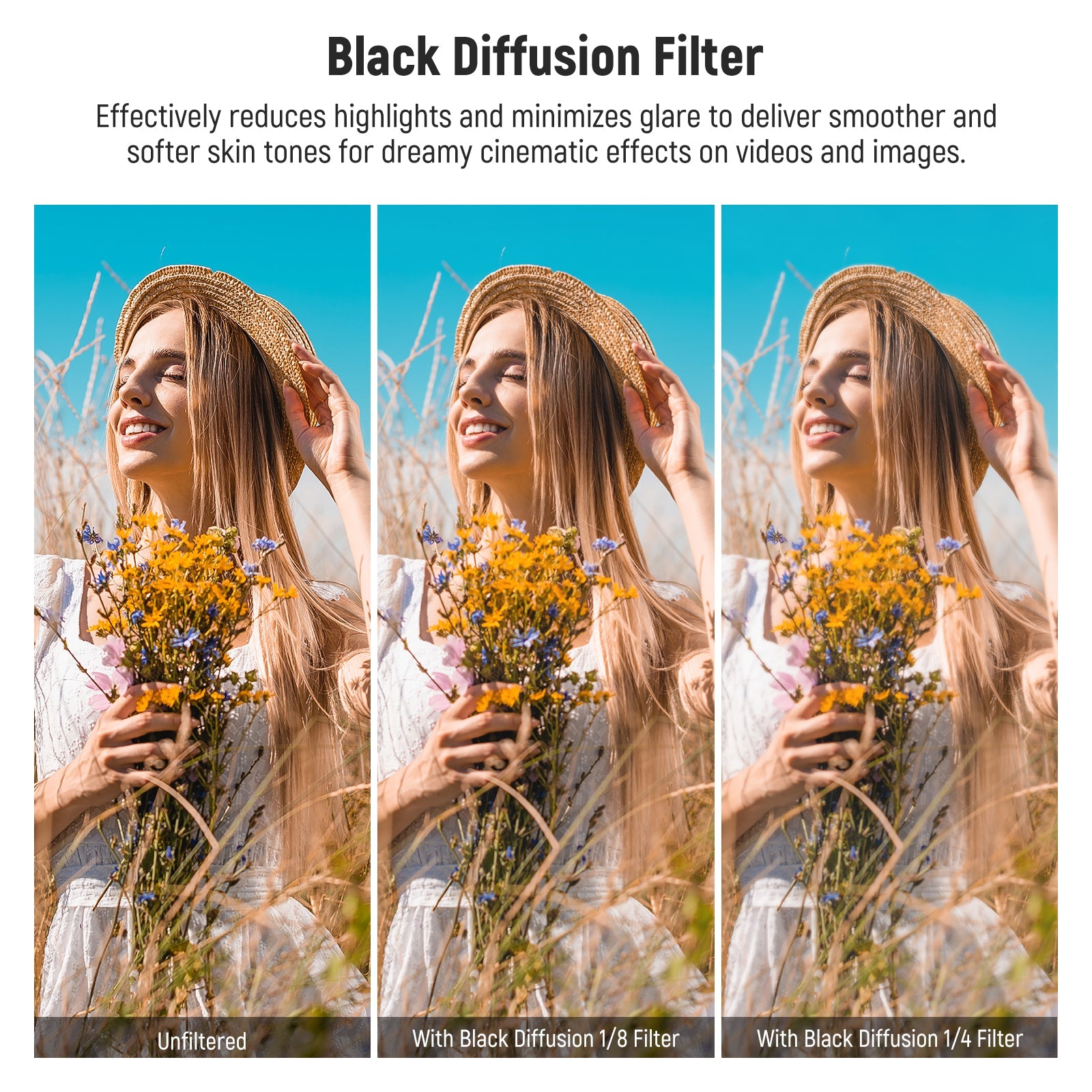 - Ambiente cinematográfico suave y de ensueño : el filtro de difusión negro de 1/4 y 1/8 puede suavizar la textura de la piel al tiempo que agrega un efecto de ensueño y brumoso a sus tomas, perfecto para fotografías de retratos, selfies, escenas llenas de acción y vlogs personales como accesorios de fotografía esenciales e imprescindibles para equipos de cámara con cardán de creadores de contenido / influencers