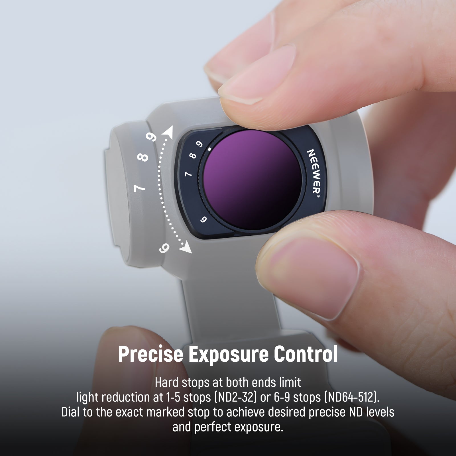 - Equilibra la exposición y mejora el color : los filtros variables ND2-32 y ND64-512 reducen la luz de 1 a 5 pasos y de 6 a 9 pasos, respectivamente. Evitan la sobreexposición en condiciones de mucha luz y permiten capturar el desenfoque de movimiento dinámico con velocidades de obturación lentas y aperturas amplias. El filtro polarizador circular elimina los reflejos en agua, vidrio y superficies no metálicas, a la vez que mejora el contraste y la saturación.