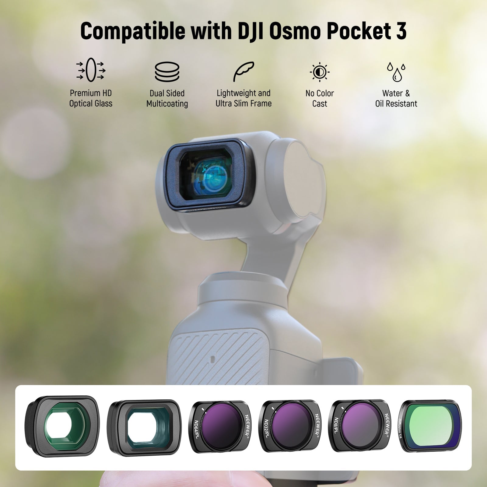 - Combinación de filtros ND y PL : Tres filtros polarizadores ND circulares reducen la luz en 3, 5 y 6 pasos para evitar la sobreexposición en entornos brillantes y permiten capturar el desenfoque de movimiento dinámico con velocidades de obturación lentas y aperturas amplias. Además, sus efectos polarizadores eliminan el reflejo en superficies no metálicas, a la vez que mejoran la saturación y el contraste. El filtro de difusión negro de 1/4 crea un efecto suave y de ensueño.