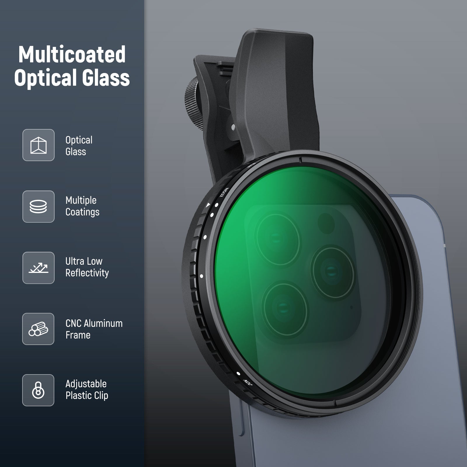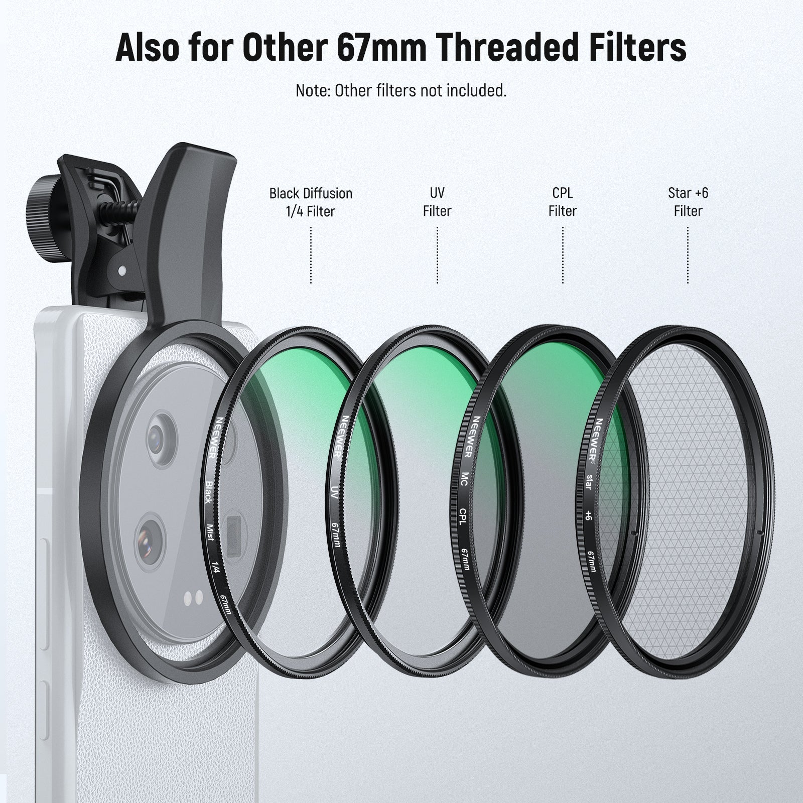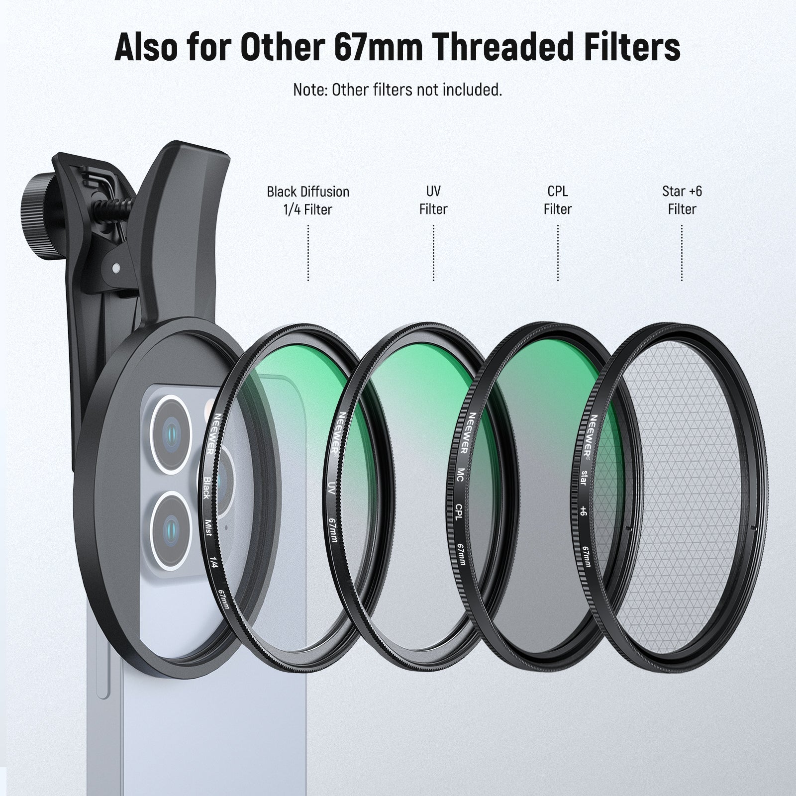 - Amplia compatibilidad : El clip de filtro para teléfono es compatible con iPhone 16 Pro Max, 16 Plus, 16e, 15 Pro Max, 15 Plus, 14, 13 mini, 12, 11 X y otros modelos de iPhone. Funciona con cualquier filtro de 67 mm, incluyendo CPL, ND, UV, Starlight, Black Difusion, GND y lentes con efecto de veta azul/dorada.