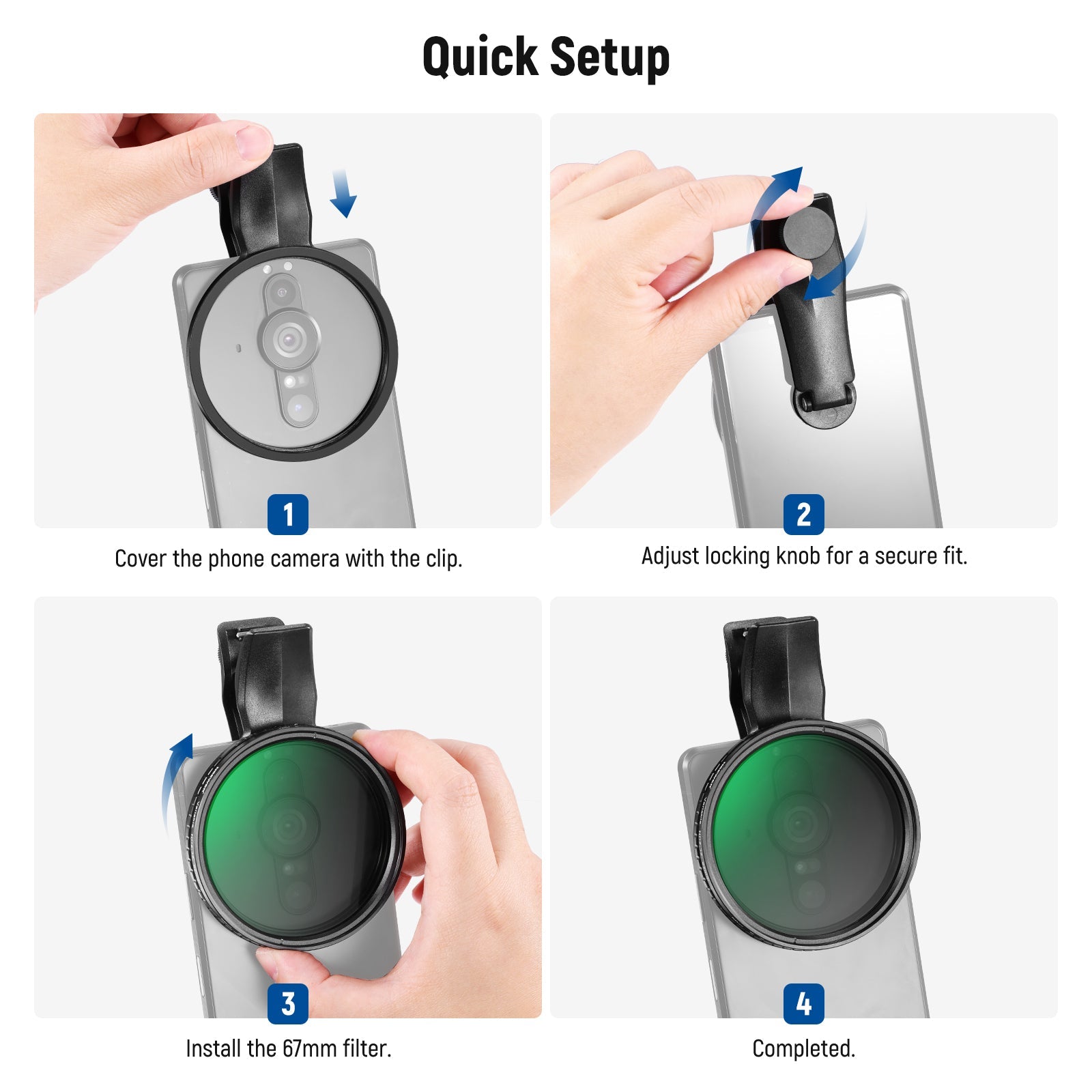 - Clip seguro y ajustable : El clip para filtro cuenta con un tornillo ajustable que permite personalizar la apertura y asegurarlo firmemente durante el uso. Las almohadillas de goma suaves y antideslizantes aportan estabilidad y protegen el teléfono de arañazos.