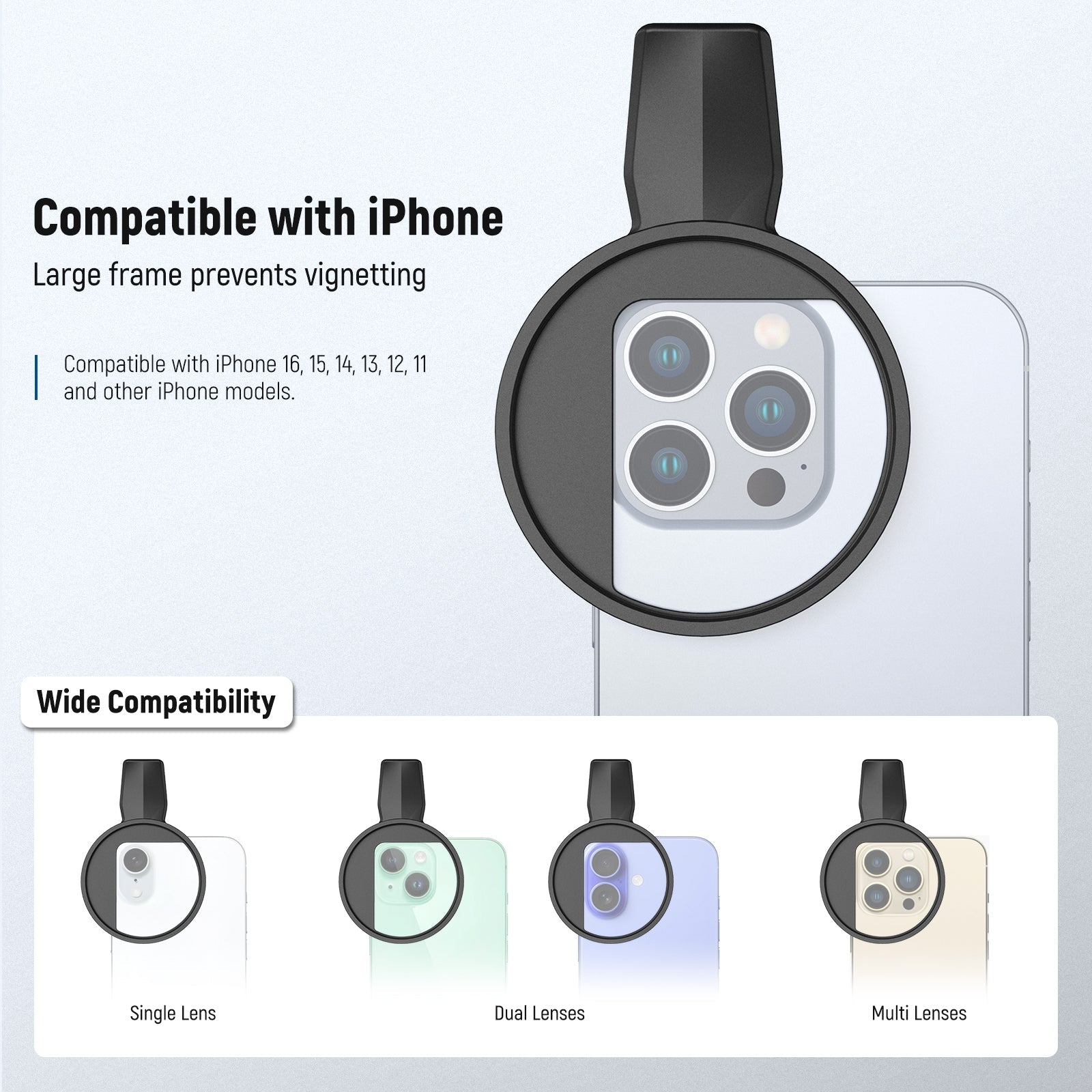 - Amplia compatibilidad : El clip de filtro para teléfono es compatible con iPhone 16 Pro Max, 16 Plus, 16e, 15 Pro Max, 15 Plus, 14, 13 mini, 12, 11 X y otros modelos de iPhone. Funciona con cualquier filtro de 67 mm, incluyendo CPL, ND, UV, Starlight, Black Difusion, GND y lentes con efecto de veta azul/dorada.
