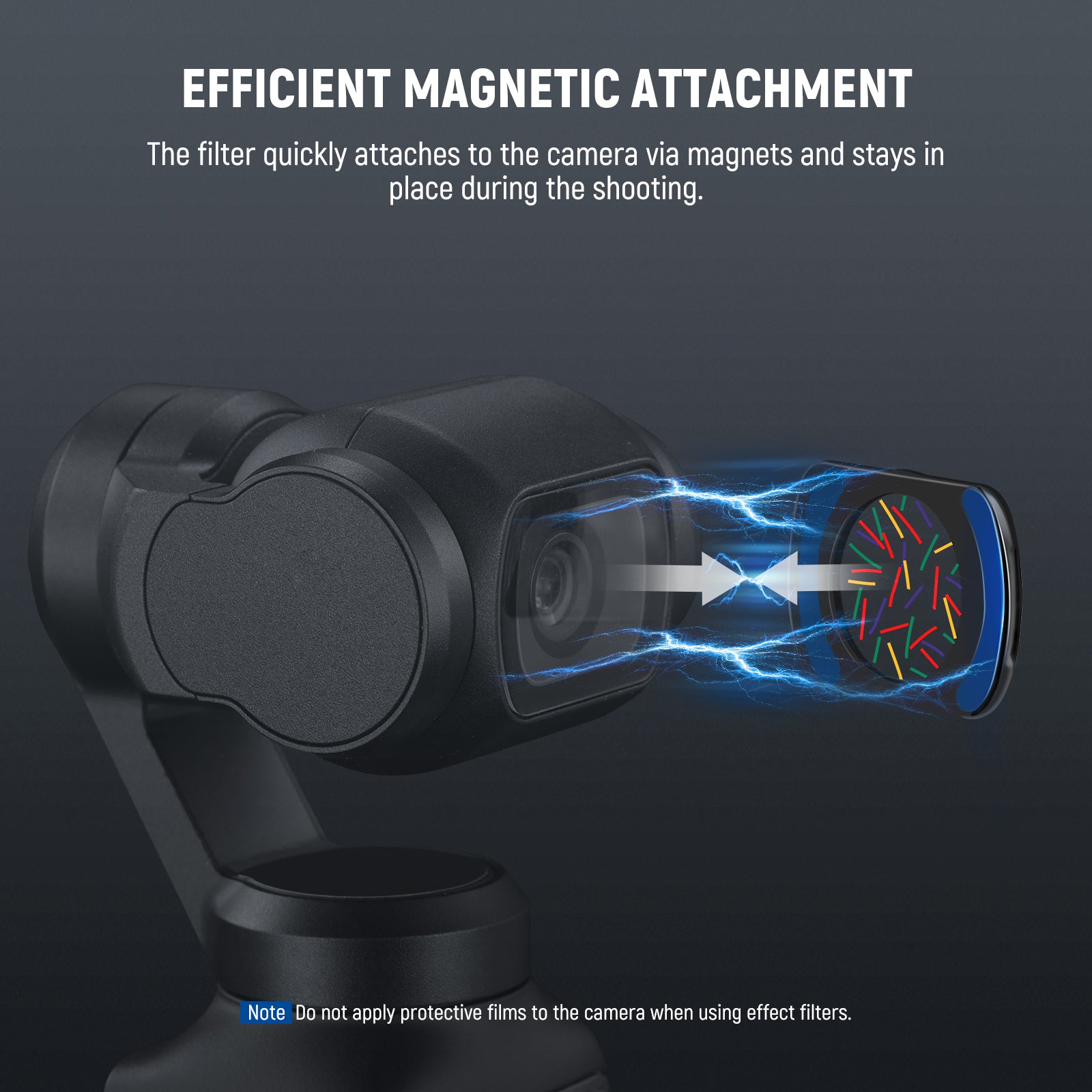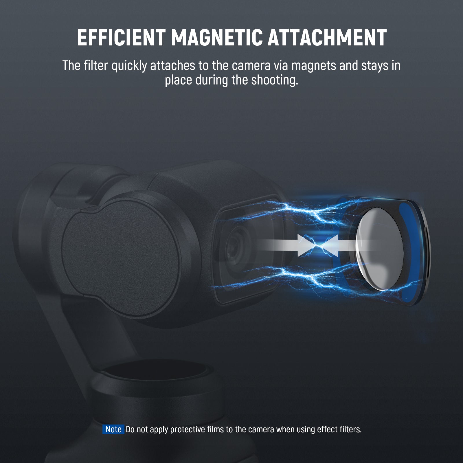 - Efficient Magnetic Attachment- The filter quickly attaches to the camera via magnets and stays in place during the shooting. Its slim frame ensures seamless gimbal calibration and storage