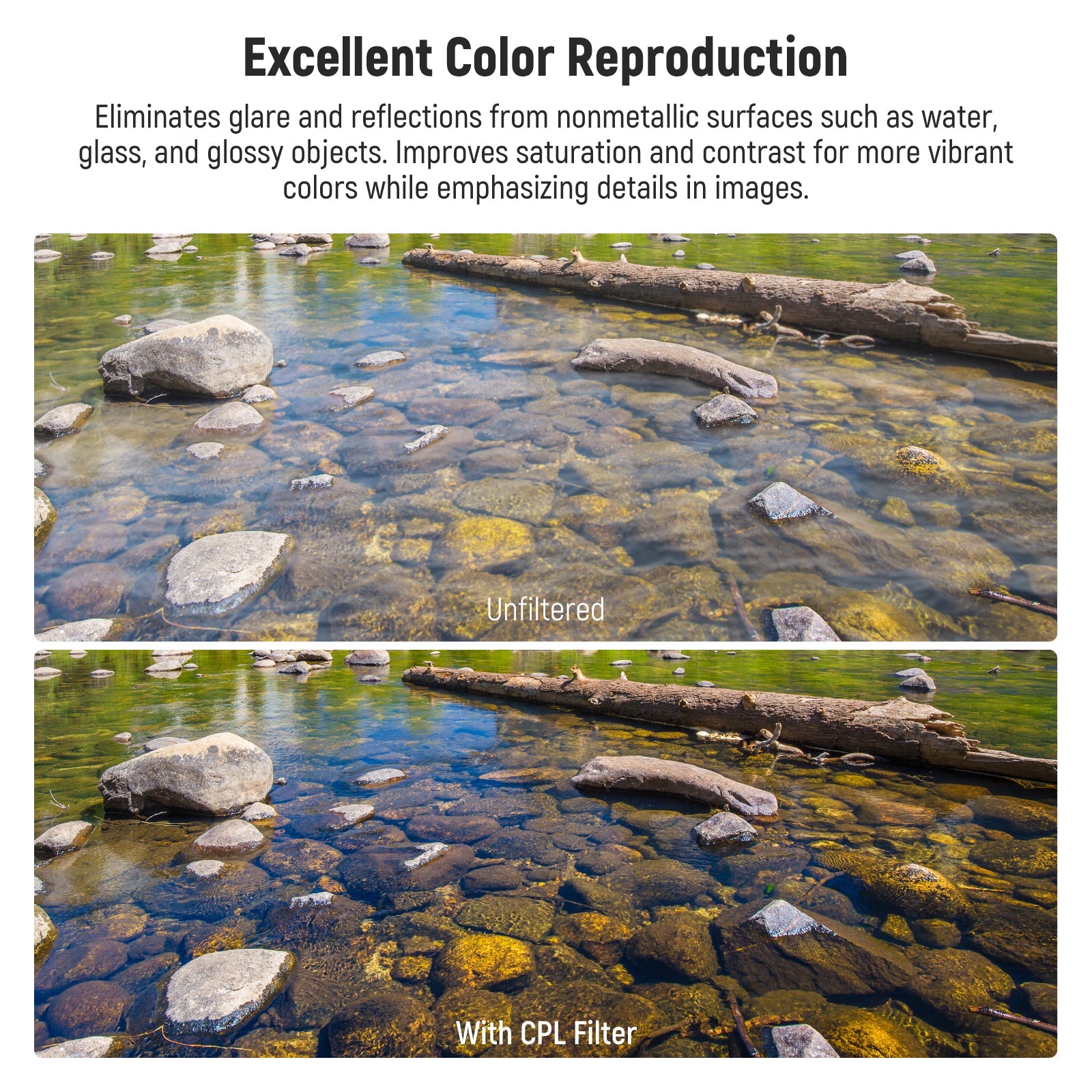 - Reduce los reflejos no deseados : elimina el resplandor y los reflejos de superficies no metálicas como agua, vidrio y objetos brillantes.
