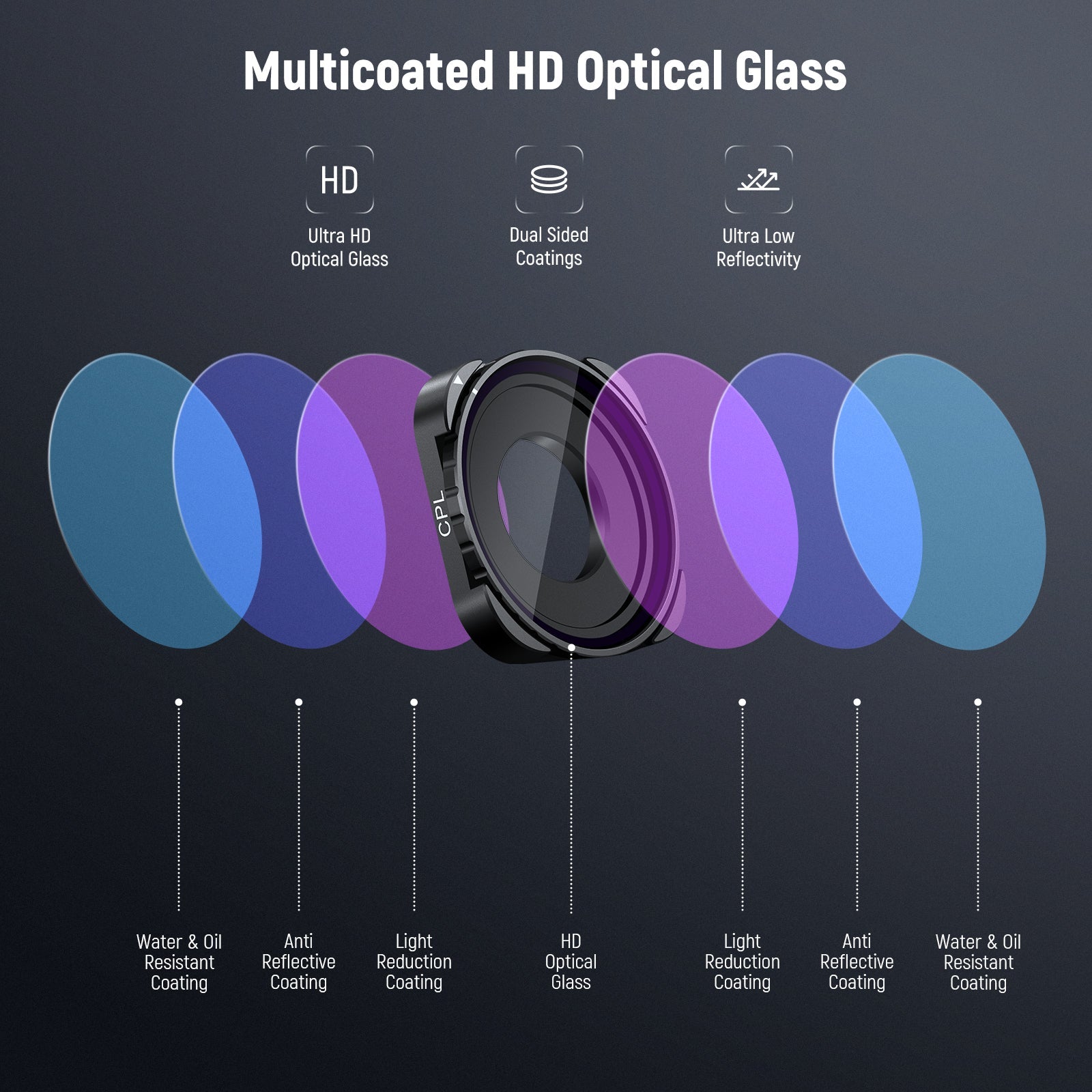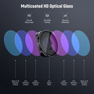 - Vidrio óptico HD multicapa : El vidrio óptico HD ofrece una claridad y fidelidad de color excepcionales. Sus múltiples capas en ambas caras son resistentes al agua, huellas dactilares, manchas y arañazos, lo que garantiza una alta durabilidad y una fácil limpieza durante las tomas en exteriores.
