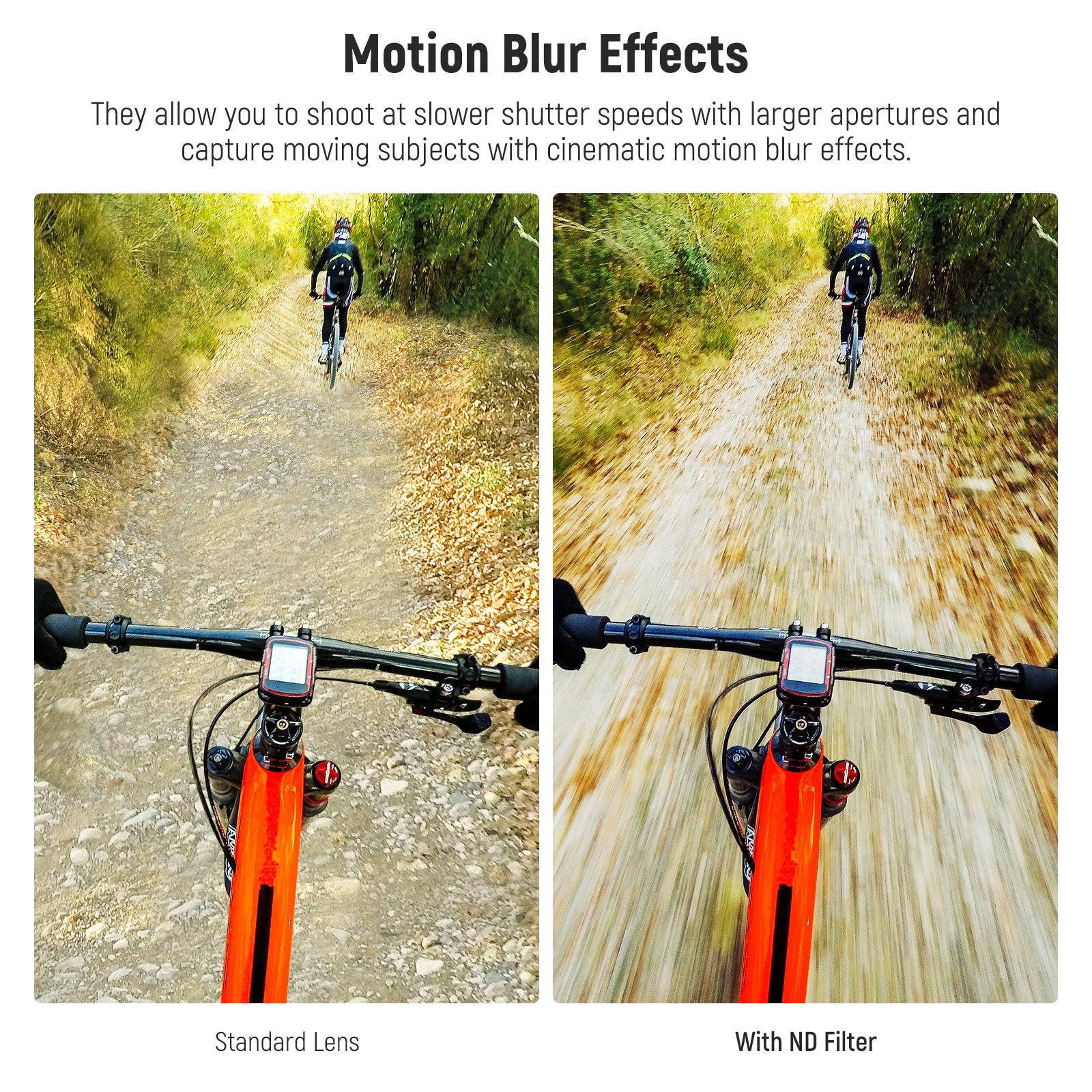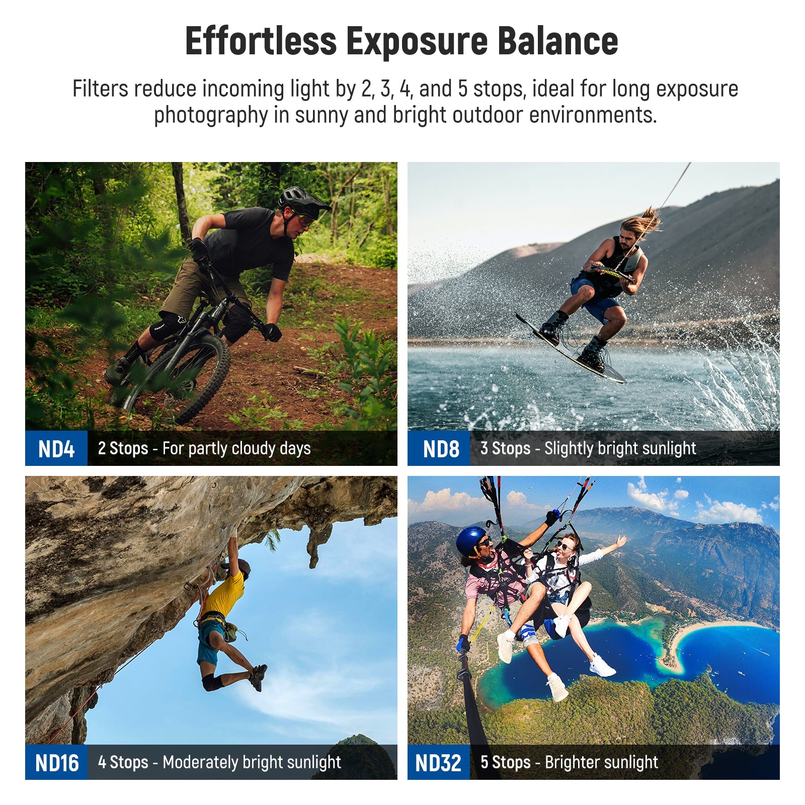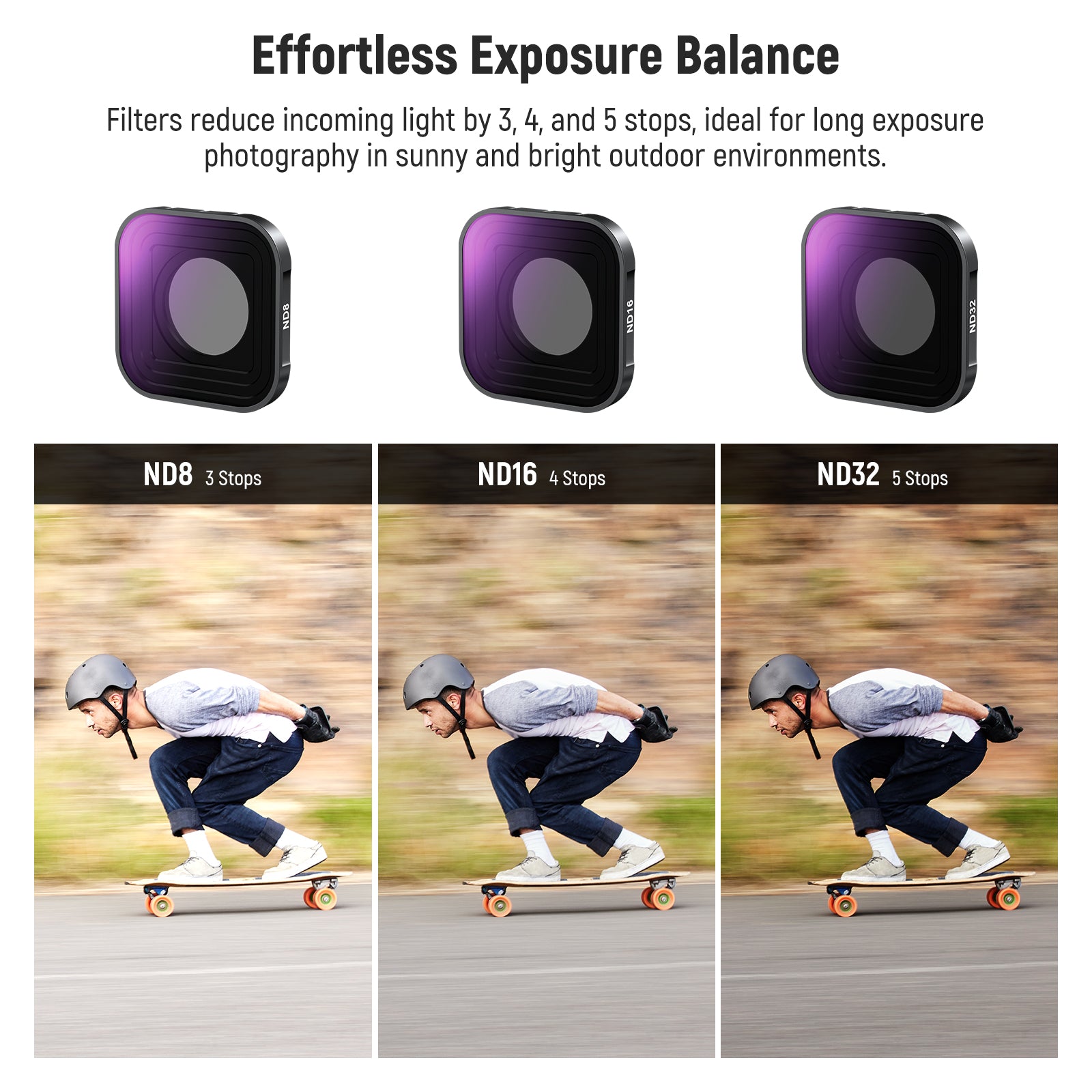 - Equilibrio de exposición sin esfuerzo : los filtros ND4, ND8, ND16 y ND32 reducen la luz en 2, 3, 4 y 5 pasos respectivamente, lo que resulta adecuado para fotografías de exposición prolongada en días soleados y brillantes. Le permiten disparar a velocidades de obturación más lentas con aperturas más grandes y capturar sujetos en movimiento con efectos de desenfoque de movimiento cinematográficos