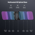 - Vidrio óptico HD multicapa : el vidrio óptico HD ofrece una claridad y fidelidad de color excepcionales. Los múltiples revestimientos en ambos lados son resistentes al agua, las huellas dactilares, las manchas y los rayones, lo que garantiza una alta durabilidad y una fácil limpieza durante las tomas al aire libre.