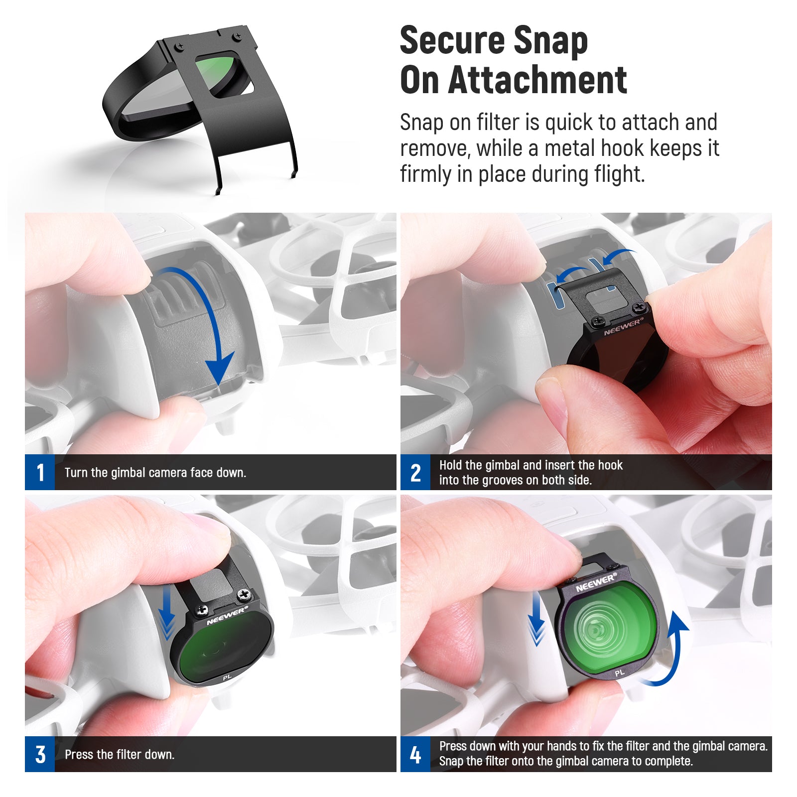 - Fijación segura a presión : El filtro a presión se coloca y retira rápidamente, y un gancho metálico lo mantiene firmemente en su lugar durante el vuelo. Su diseño delgado evita el viñeteo en la cámara y no afecta el uso del protector del estabilizador.