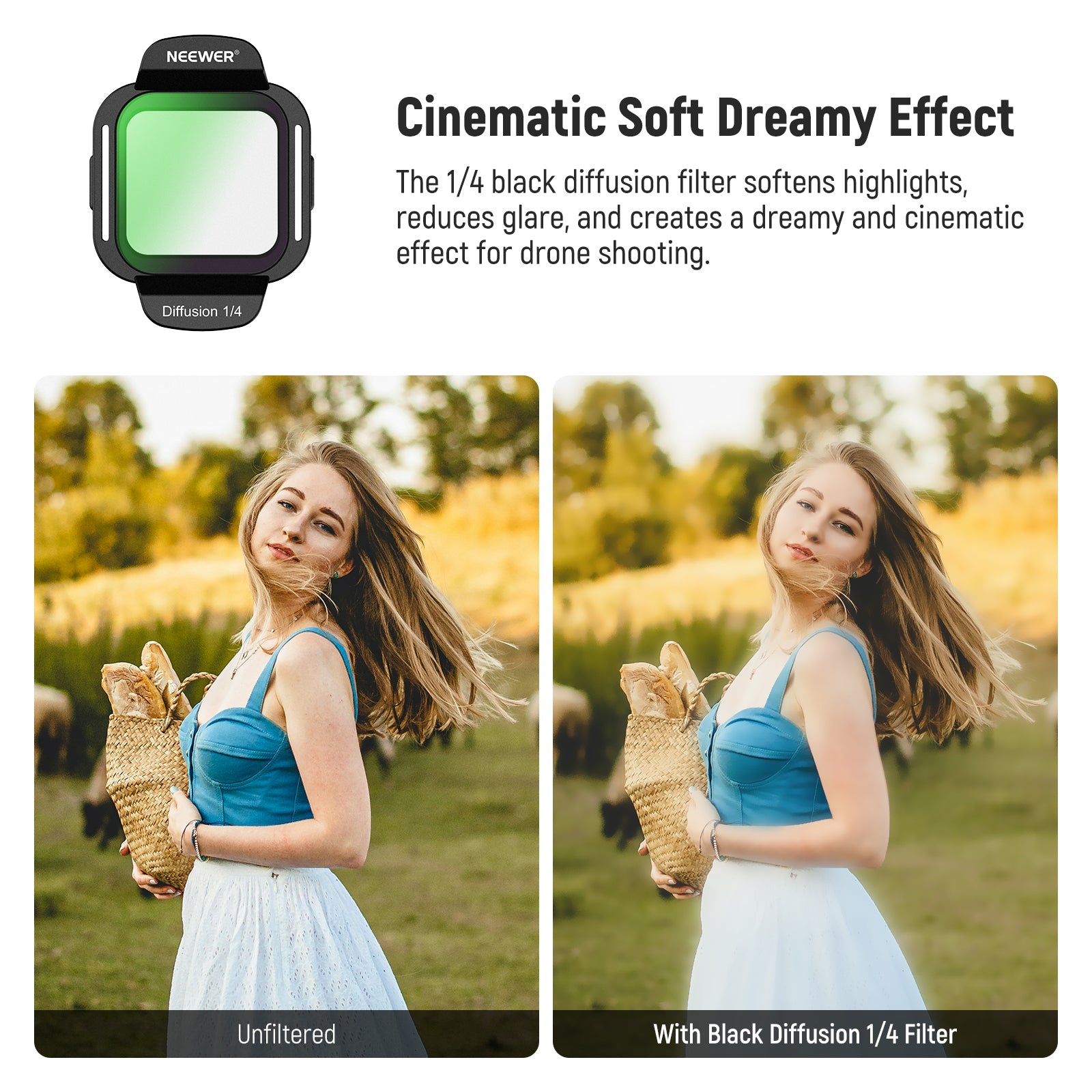 - Efecto de ensueño suave cinematográfico : el filtro de difusión negro de 1/4 suaviza los reflejos, reduce el resplandor y crea un efecto de ensueño y cinematográfico para tomar fotografías con drones.