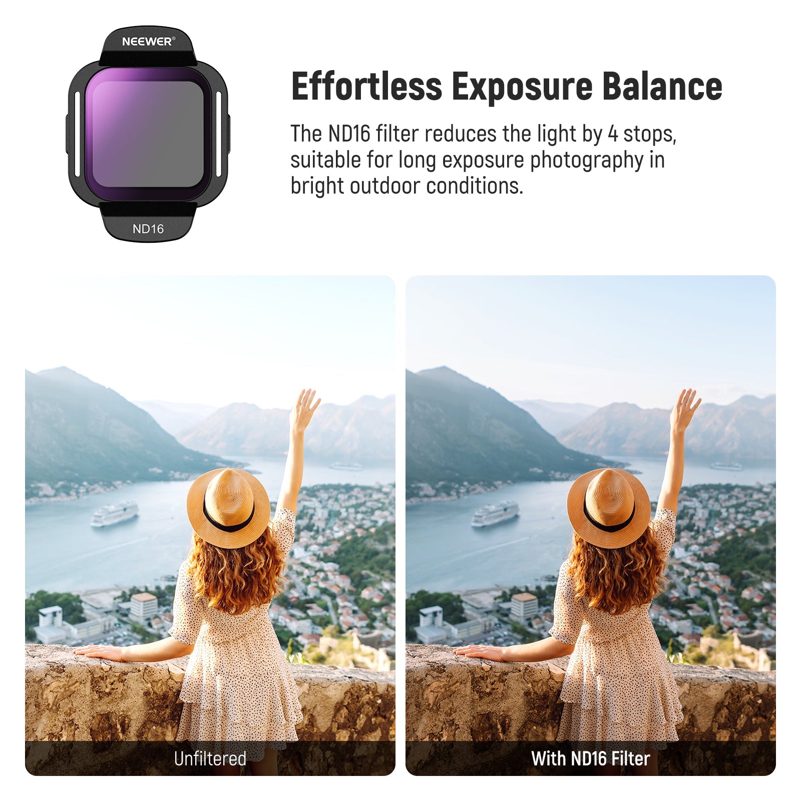 - Equilibrio de exposición sin esfuerzo : El filtro ND16 reduce la luz en 4 pasos, ideal para fotografías de larga exposición en exteriores con mucha luz. Permite disparar con velocidades de obturación más lentas y aperturas más amplias, y capturar movimientos con efectos de desenfoque de movimiento expresivos.