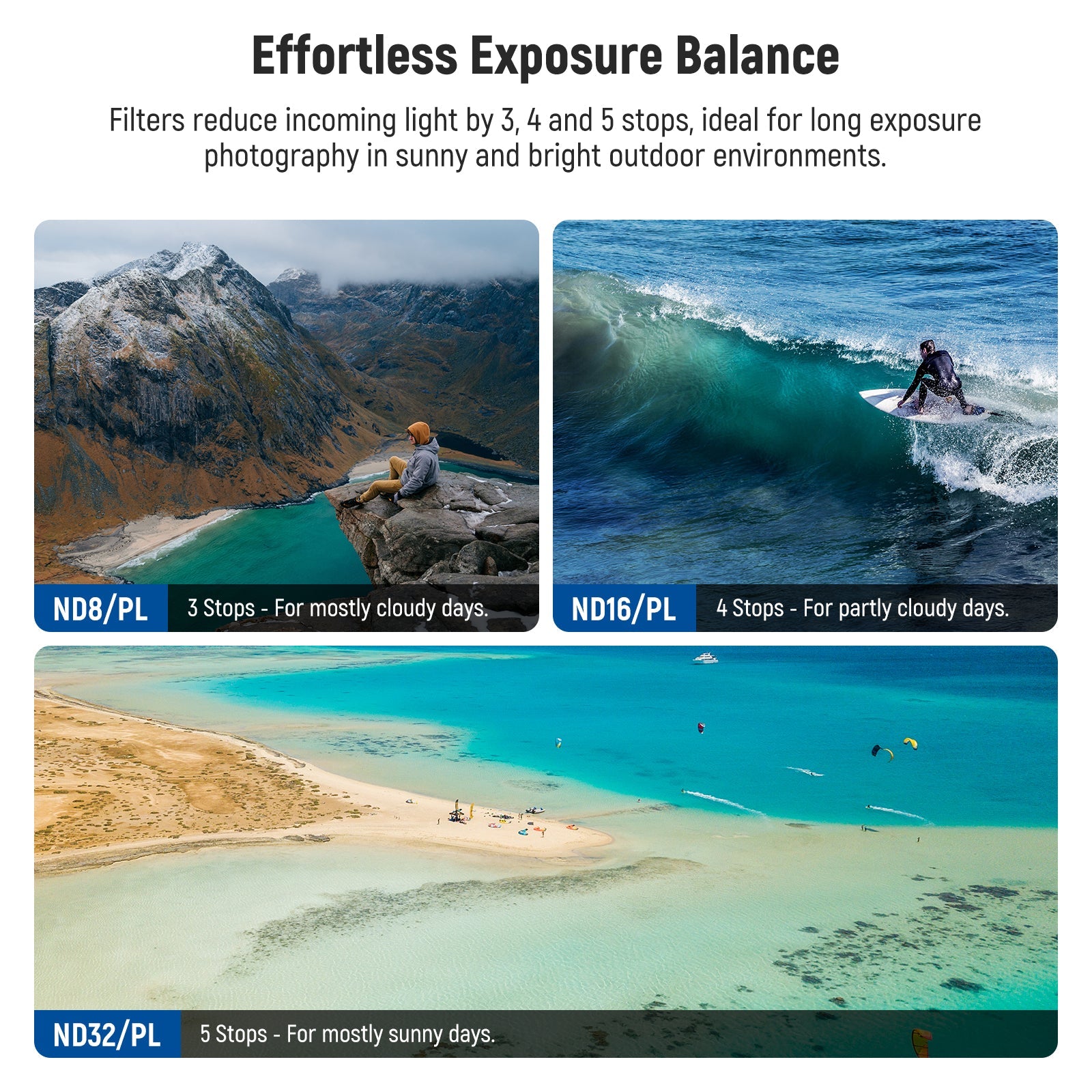 - Combinación de filtros ND y PL : Tres filtros ND/PL (ND8/PL, ND16/PL, ND32/PL) reducen la luz en 3, 4 y 5 pasos respectivamente. Combinan efectos ND y polarizadores, permiten un control preciso de la exposición y mejoran el color, el contraste y el detalle de las imágenes, a la vez que reducen eficazmente los reflejos y los destellos. Al simplificar el flujo de trabajo, son ideales para la grabación de vídeo en exteriores y la fotografía de paisajes.