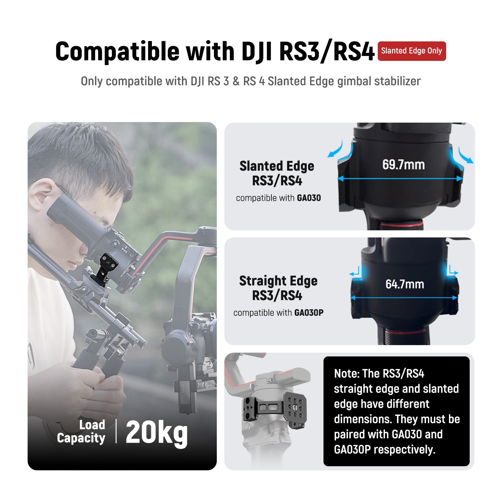 - Compatible con DJI RS3/RS4 de borde inclinado : debido a las diferencias de versión y tamaño, el GA030 solo es compatible con los modelos RS3/RS4 con puertos NATO inclinados y un ancho de 69,7 mm. Si su RS3/RS4 tiene puertos NATO rectos y un ancho de 64,7 mm, elija el GA030P. Este adaptador de montura incluye dos rieles NATO y una placa QR compatible con Arca Swiss.