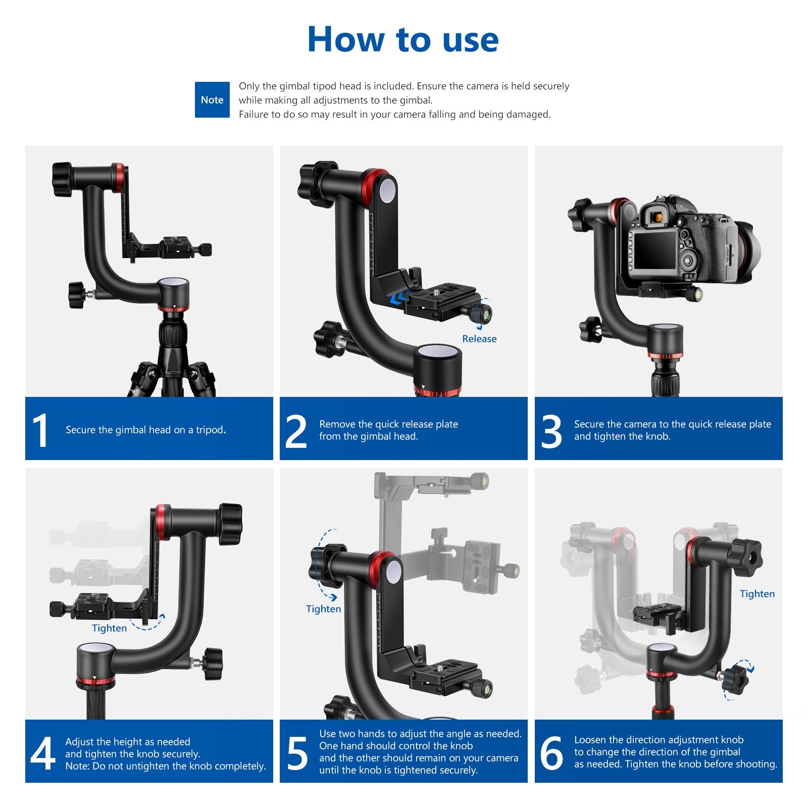 - El cabezal de trípode Gimbal equilibra la cámara y la lente a lo largo de los ejes vertical y horizontal. La estructura de soporte incorporada hace que se muevan con suavidad y fluidez. Perfecto para observar aves y tomar fotografías de vida silvestre y deportes.