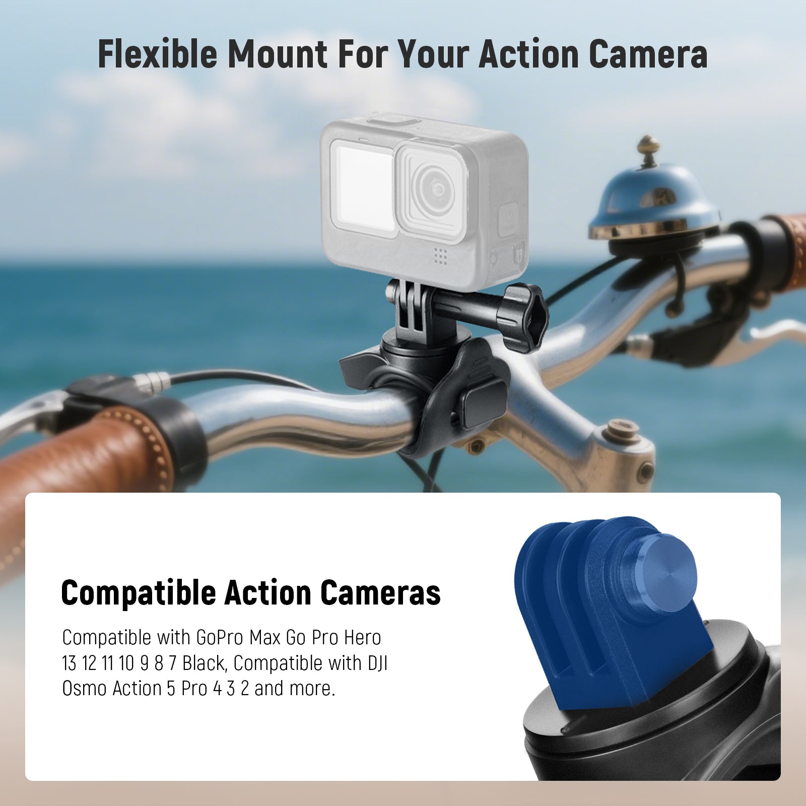 - Versatile & Flexible Camera Mount- The camera mount features a flexible elastic band and a universal action camera mount adapter, compatible with GoPro Max go pro Hero 13 12 11 10 9 8 7 Black compatible with DJI Osmo Action 5 Pro 4 3 2, also for 2 prong mount compatible with Insta360 X5 X4 X3 Insta 360 Ace Pro and more, ideal accessories kit for overhead shots, outdoor photography, vlogging, live streaming, motorcycle attachment pack for POV video recording, and other videography