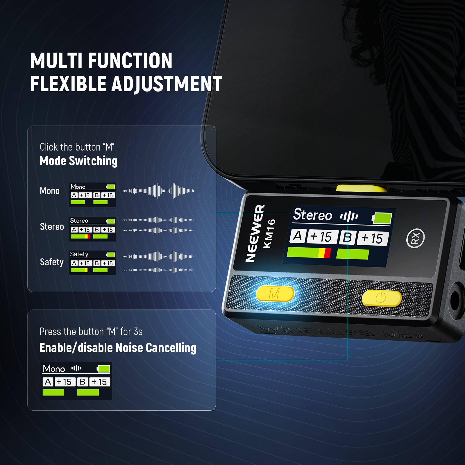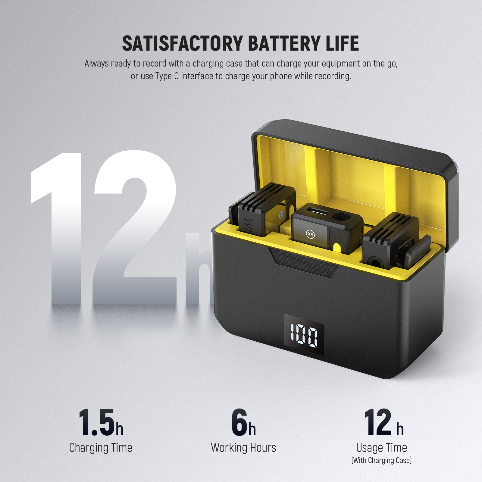 - Duración de la batería de 12 horas : a diferencia de los micrófonos tradicionales, el KM16 viene con su propio estuche de carga. El estuche de carga puede cargar completamente el RX/TX y pueden durar 6 horas después de estar completamente cargados. La duración total de la batería del producto es de hasta 12 horas. Hay un indicador de energía en el estuche de carga, y el RX tiene una pantalla y un puerto de monitoreo de 3,5 mm. El estuche de carga compacto y portátil permite cargar en cualquier momento y en cualquier lugar.