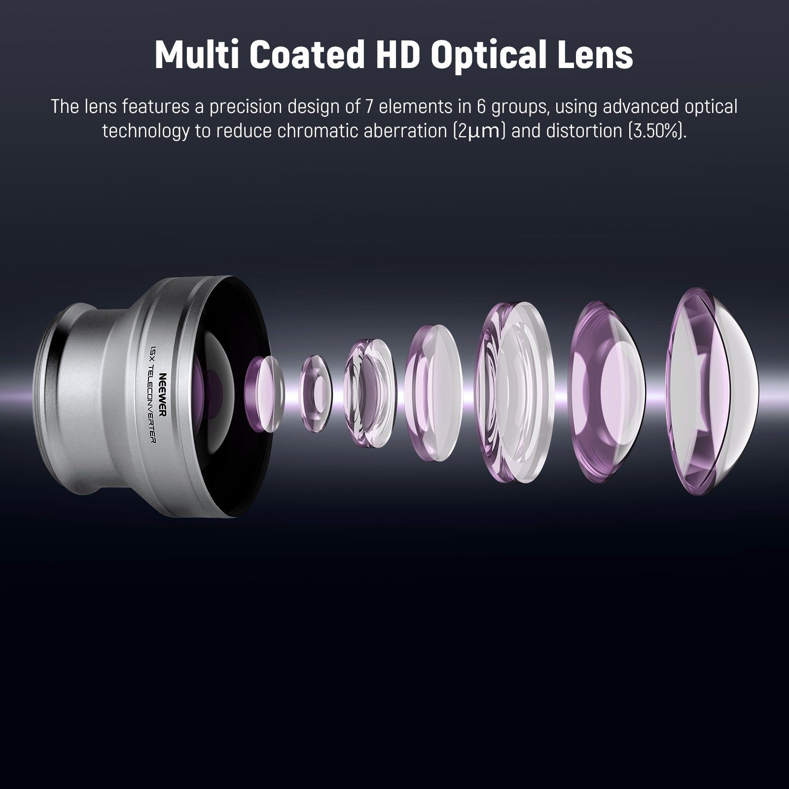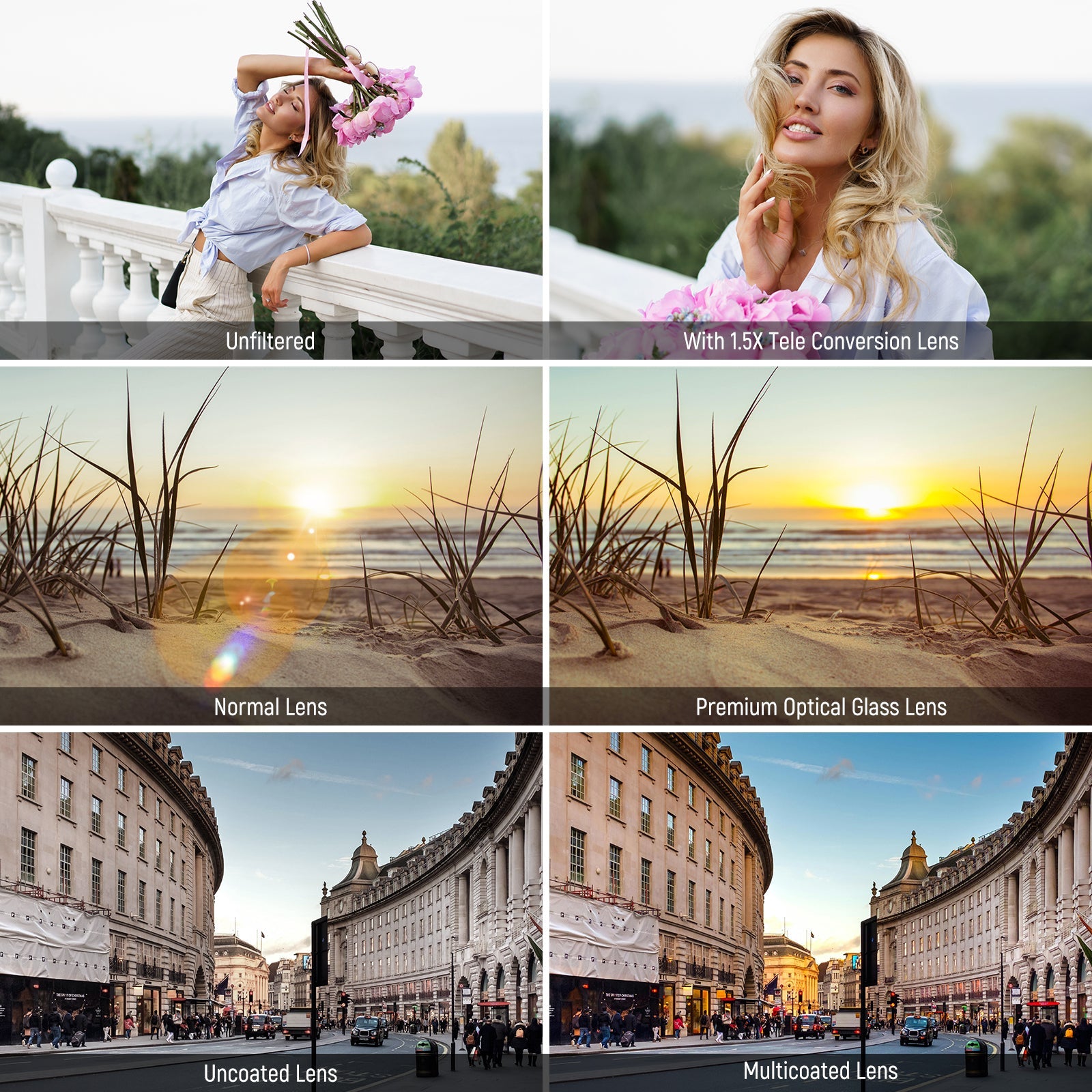 - Vidrio óptico con revestimiento múltiple : la conversión Tele de 1,5x extiende la distancia focal al tiempo que preserva la claridad y los detalles de la imagen, brindando colores nítidos y reales.