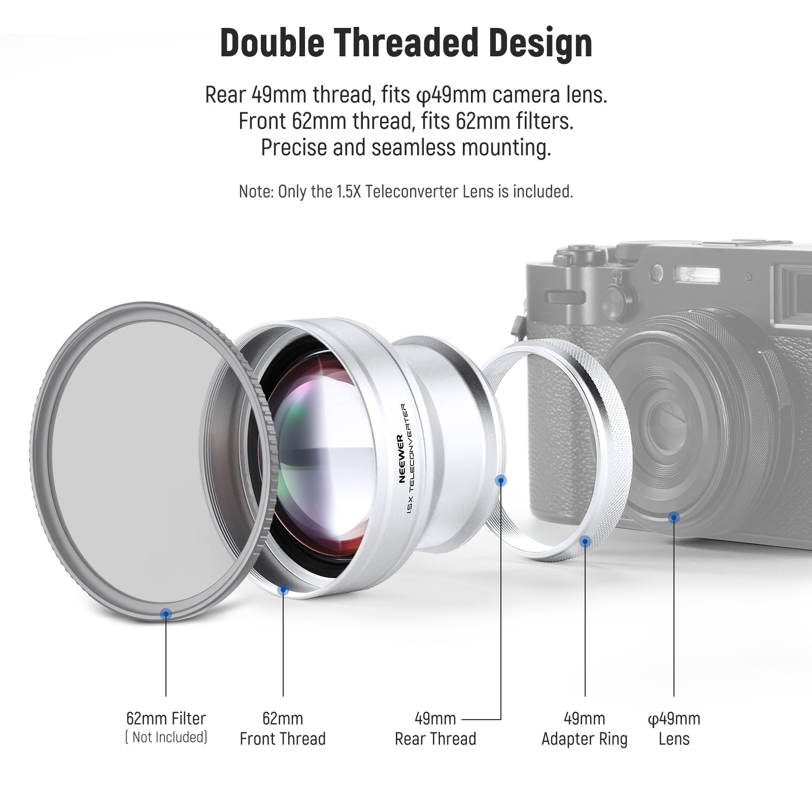 - Diseño con rosca frontal de 62 mm y trasera de 49 mm : este teleconvertidor cuenta con una rosca frontal de 62 mm para colocar filtros como UV, CPL y ND. Es totalmente compatible con las cámaras de la serie X100 que utilizan un anillo adaptador de 49-49 mm. Sin el adaptador, se adapta a lentes con una rosca de 49 mm.