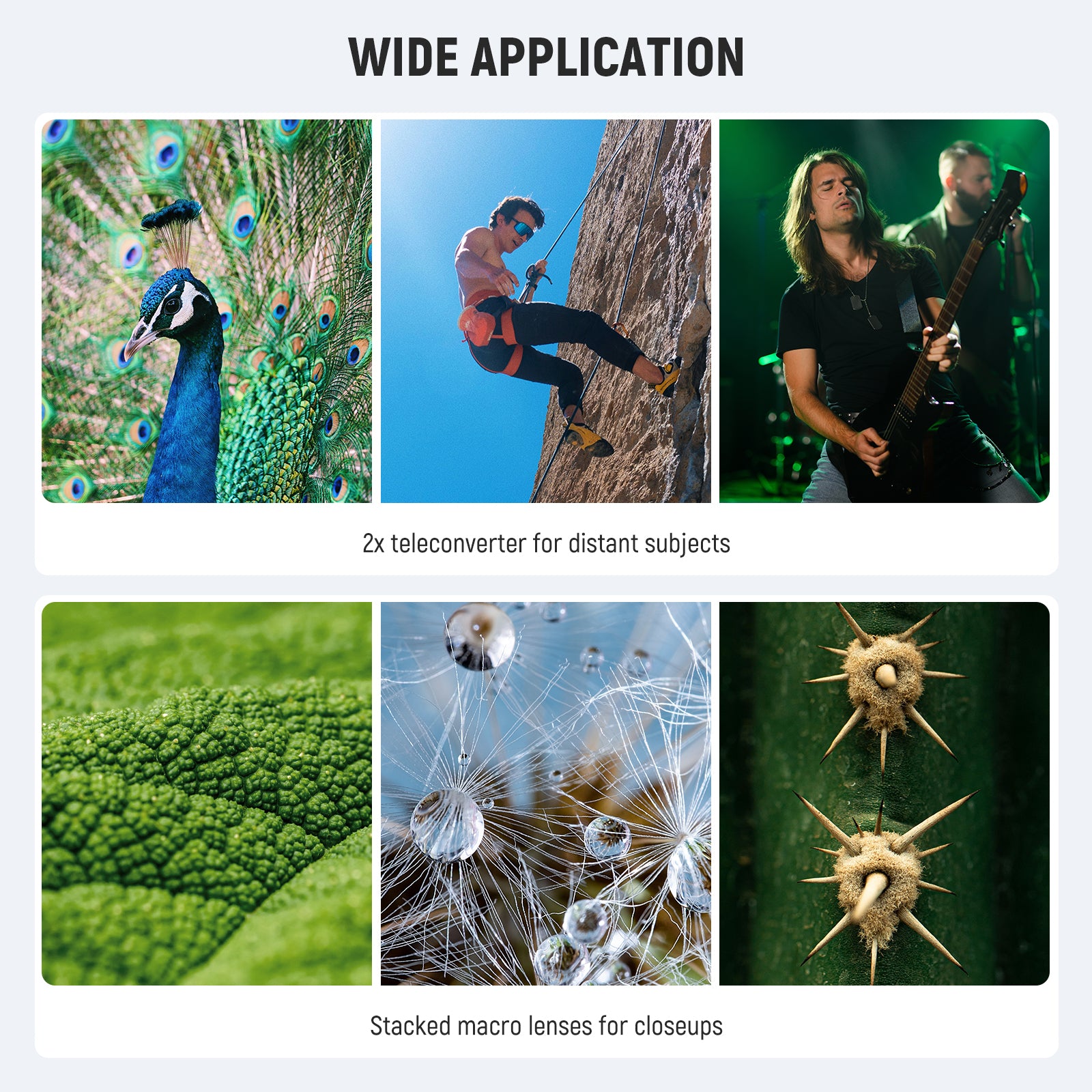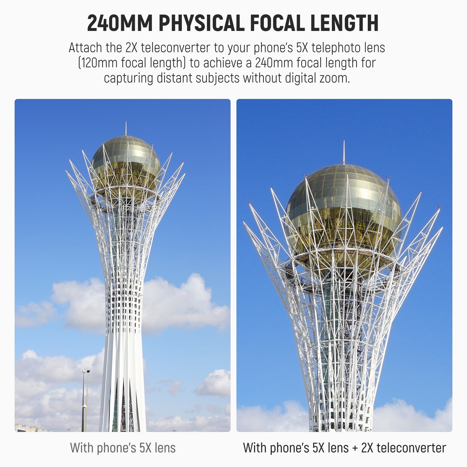 - Convertidor de teleobjetivo 2x : Diseñado para smartphones con teleobjetivo 5x integrado, este convertidor duplica la capacidad de zoom óptico, convirtiendo un objetivo 5x (equivalente a 120 mm) en un potente zoom 10x (equivalente a 240 mm). Permite capturar imágenes a distancia sin recortes digitales ni pérdida de imagen.
