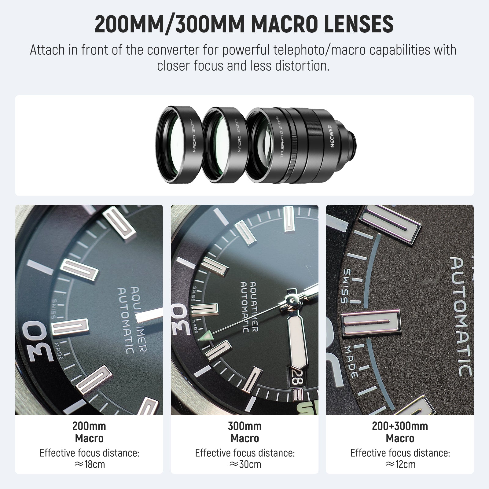 - Lentes macro de 200 mm/300 mm : Conecte estos lentes macro delante del convertidor para obtener potentes funciones de teleobjetivo macro con un enfoque más preciso y menos distorsión. Úselos individualmente para diferentes aumentos (200 mm o 300 mm) o apílelos para un efecto de aumento más potente.
