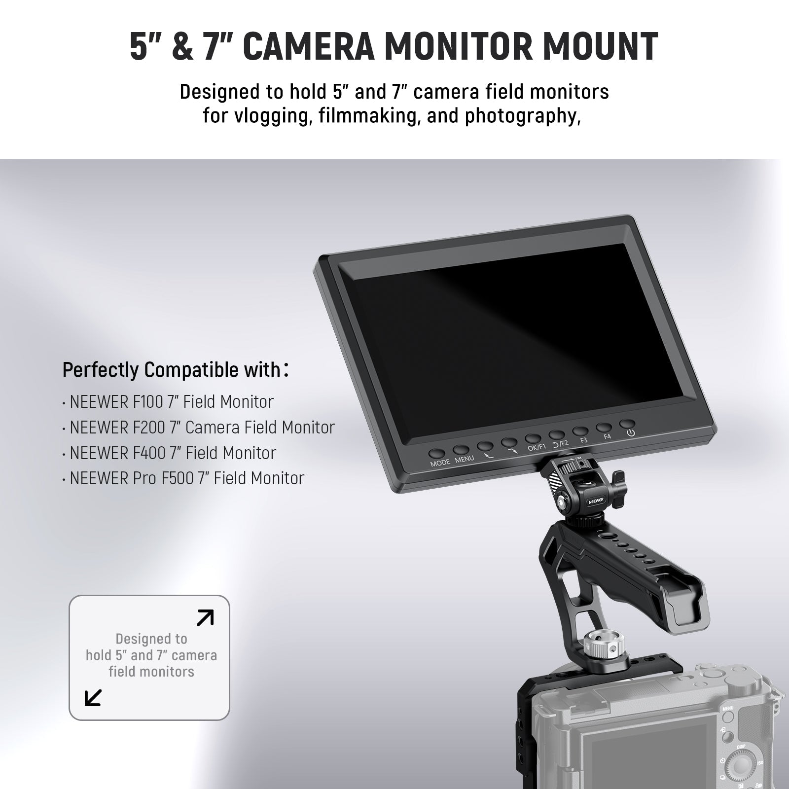 - Para monitores de campo de cámara de 5" y 7" : diseñado para monitores de campo de cámara de 5" y 7", este soporte de monitor con zapata fría es compatible con jaulas de cámara SmallRig y NEEWER compatibles con cámaras Canon Sony Nikon Fujifilm Fuji, plataformas de video, accesorios de manija superior, manijas laterales, manijas de correa de cardán y zapatas de cámara, perfecto para vlogs, filmación y fotografía