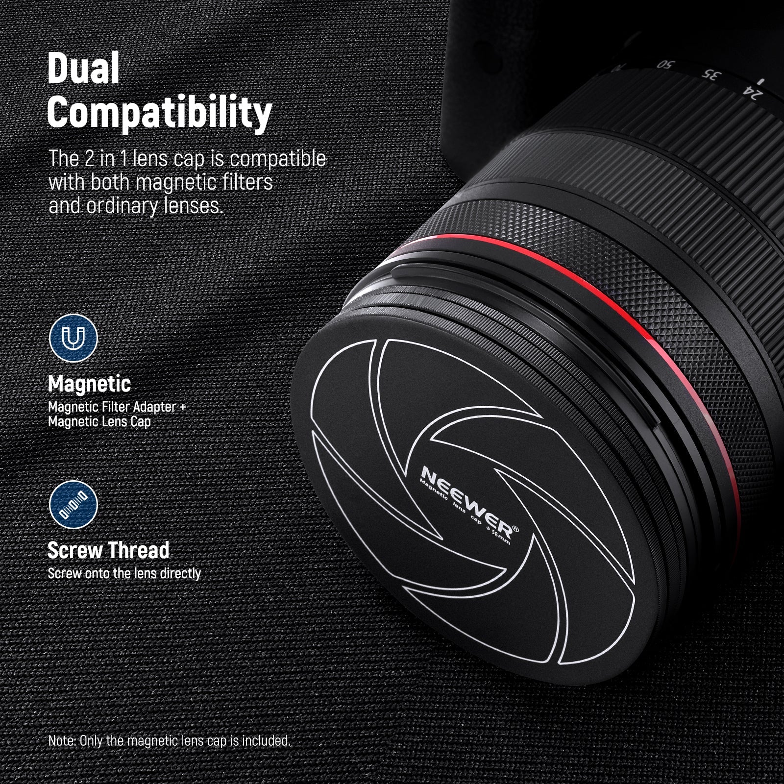 - Compatibilidad dual : se requiere un anillo adaptador magnético adicional para habilitar la función magnética de la tapa de la lente en lentes de cámara no magnéticas. Esta tapa de lente de metal magnético es compatible tanto con un sistema de filtro magnético de 67 mm como con lentes no magnéticos normales de 67 mm. Cambie fácilmente la tapa magnética de la lente de un filtro magnético de lente de cámara o atorníllela en una lente de cámara normal de 67 mm con rosca de 67 mm.