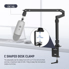 - Soporte de escritorio con brazo de micrófono de perfil bajo y amortiguación : Fabricado en aleación de aluminio, este soporte cuenta con dos brazos articulados y una abrazadera en C de gran agarre para escritorios de 2 a 7 cm de grosor. Esto mantiene el micrófono siempre estable con una carga máxima de 1,5 kg. Su avanzado sistema de amortiguación permite que el micrófono se mueva libremente sin rebotes. Su diseño de perfil bajo permite un uso flexible en espacios reducidos y se puede plegar y guardar debajo de una pantalla de escritorio cuando no se utiliza. La estructura integrada garantiza una instalación sin herramientas adicionales.