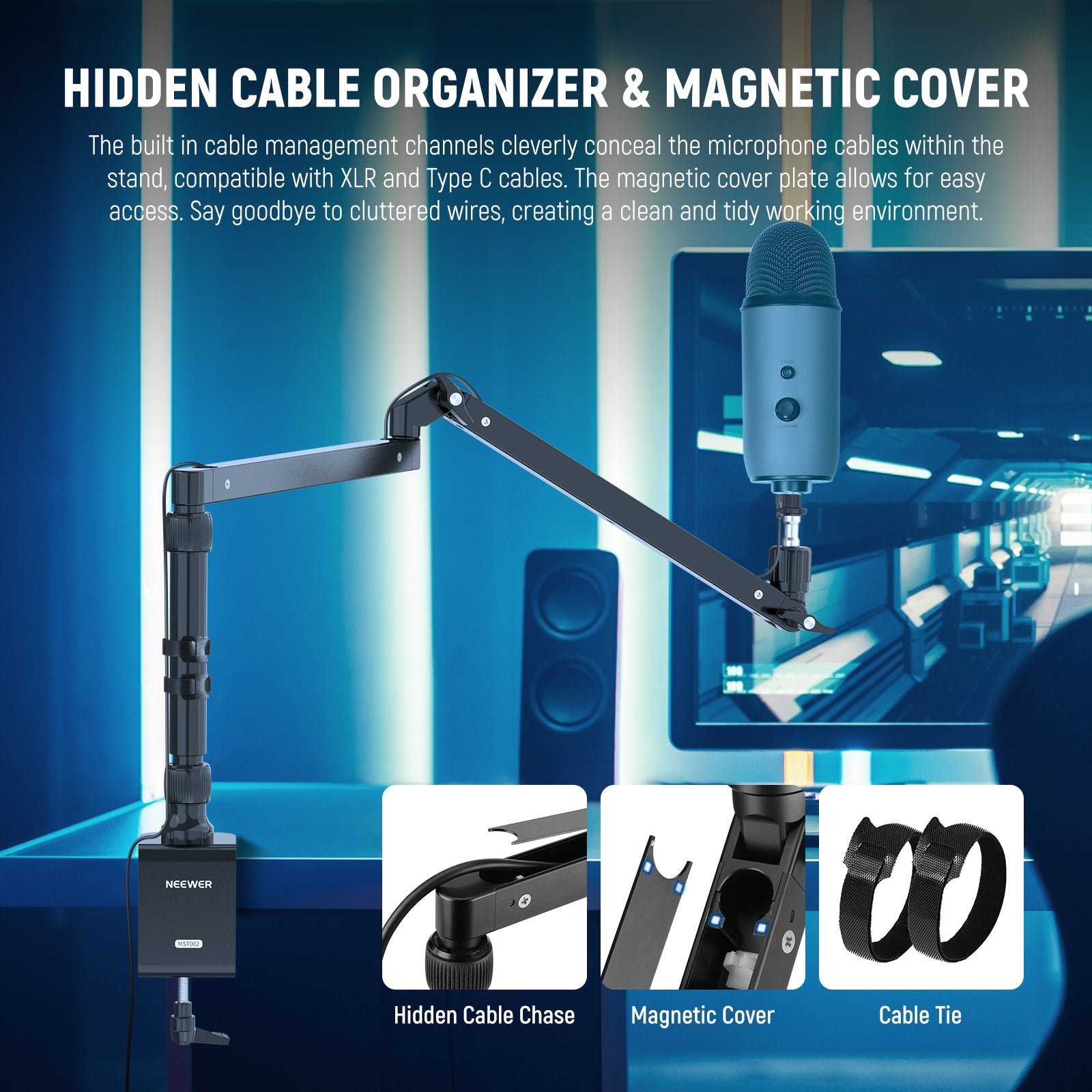 - Organizador de cables oculto y cubierta magnética : Los canales de gestión de cables integrados ocultan ingeniosamente los cables del micrófono dentro del soporte, compatible con cables XLR y tipo C. La placa de cubierta magnética facilita el acceso. Olvídate de los cables desordenados y crea un entorno de trabajo limpio y ordenado, un elemento esencial para creadores de contenido e influencers.