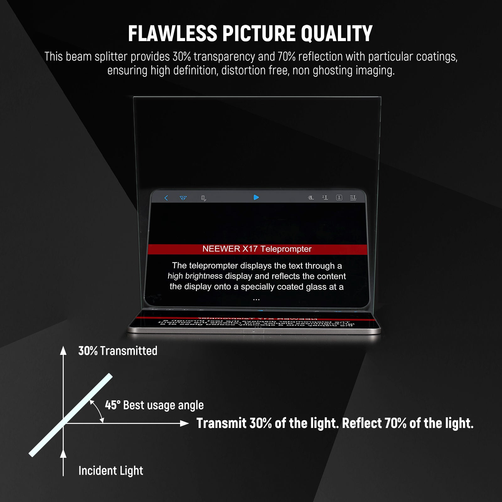 - Cristal para teleprompter profesional : el divisor de haz cúbico NEEWER HD está fabricado con la máxima calidad para lograr un reflejo nítido. Su perfecta transmisión de luz visible 30T/70R garantiza una transmisión de información clara y al mismo tiempo permite una interacción sin esfuerzo con la audiencia. Se utiliza ampliamente en producciones de video, educación, aprendizaje electrónico, eventos en vivo, salas de redacción tradicionales, estudios de televisión, etc. Nota: solo cristal divisor de haz; NO compatible con teleprompters NEEWER