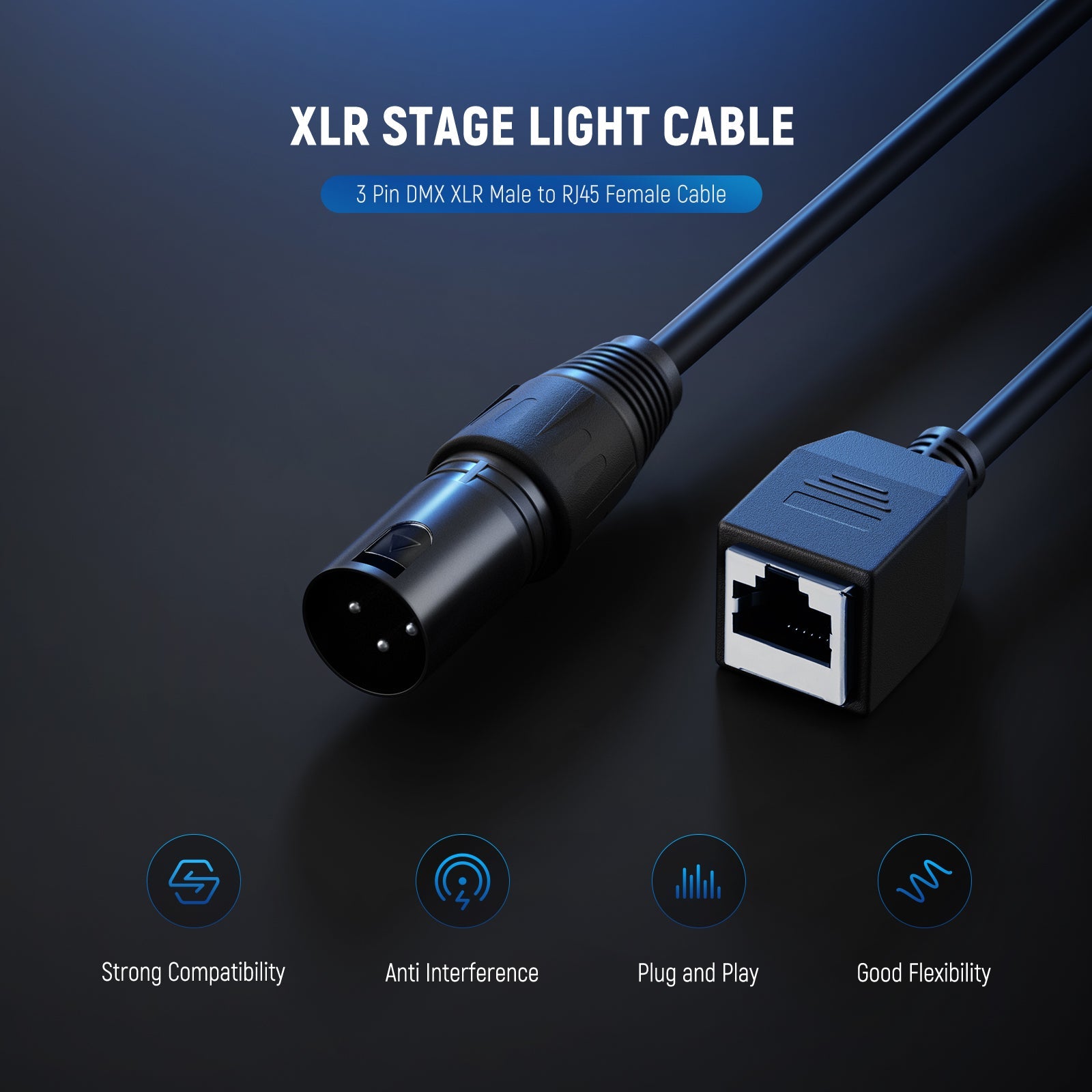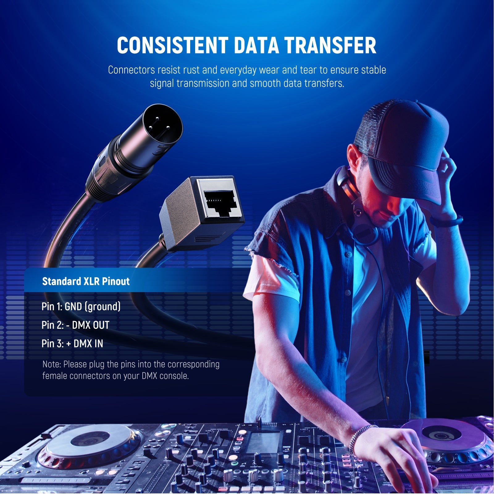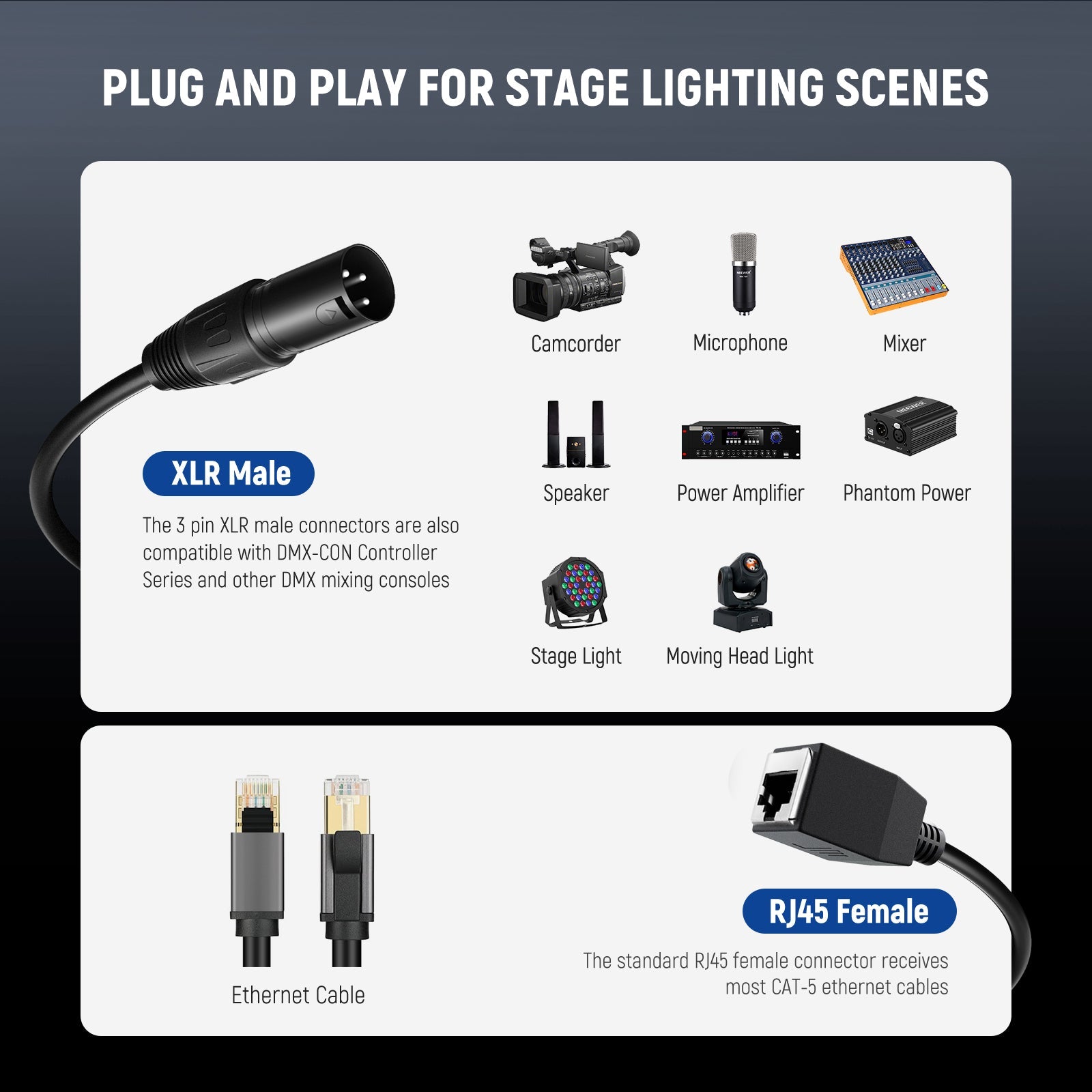 - Plug and Play para escenas de iluminación escénica : los conectores XLR macho de 3 pines también son compatibles con la serie de controladores DMX-CON y otras consolas de mezcla DMX para estudios de grabación, salas de conciertos, amplificadores, bandas, eventos en vivo y cualquier otra escena de iluminación interactiva profesional. El conector RJ45 hembra estándar admite la mayoría de los cables Ethernet CAT-5.