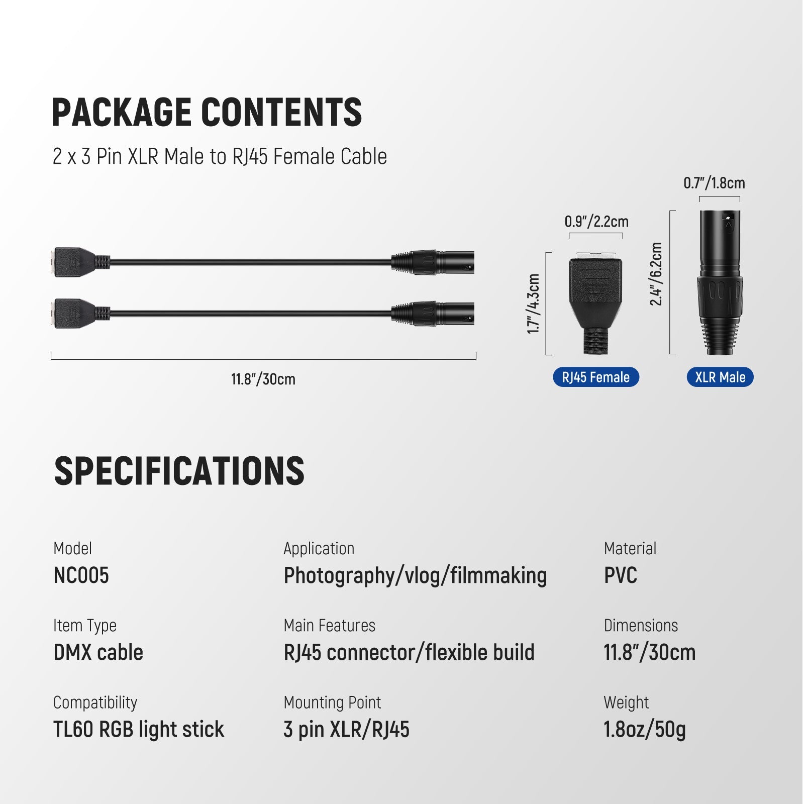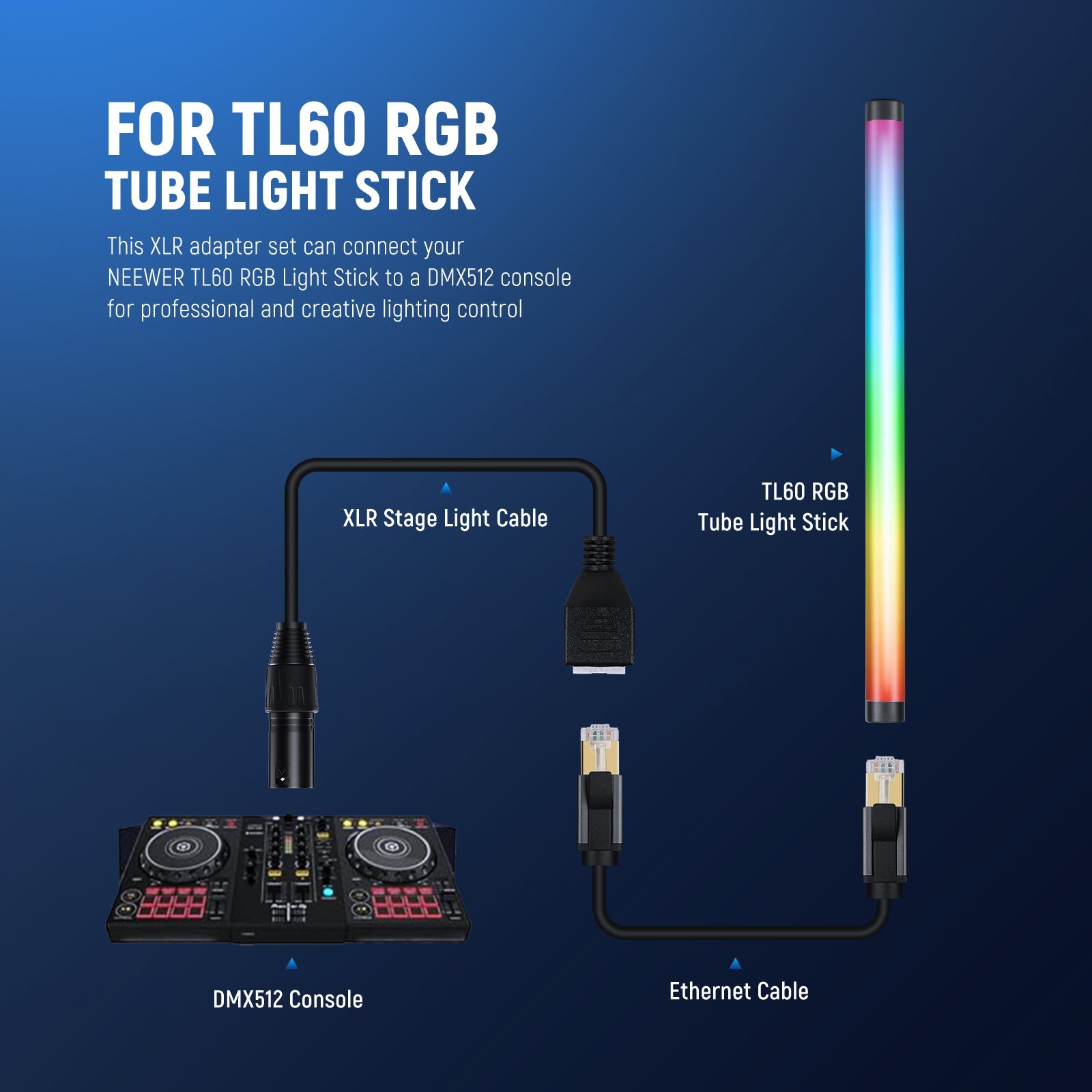 - Para barra de luz de tubo RGB : este juego de adaptadores XLR puede conectar su barra de luz RGB a una consola DMX512 para un control de iluminación profesional y creativo (solo para luz de tubo RGB NEEWER TL60/TL90C/TL120C)