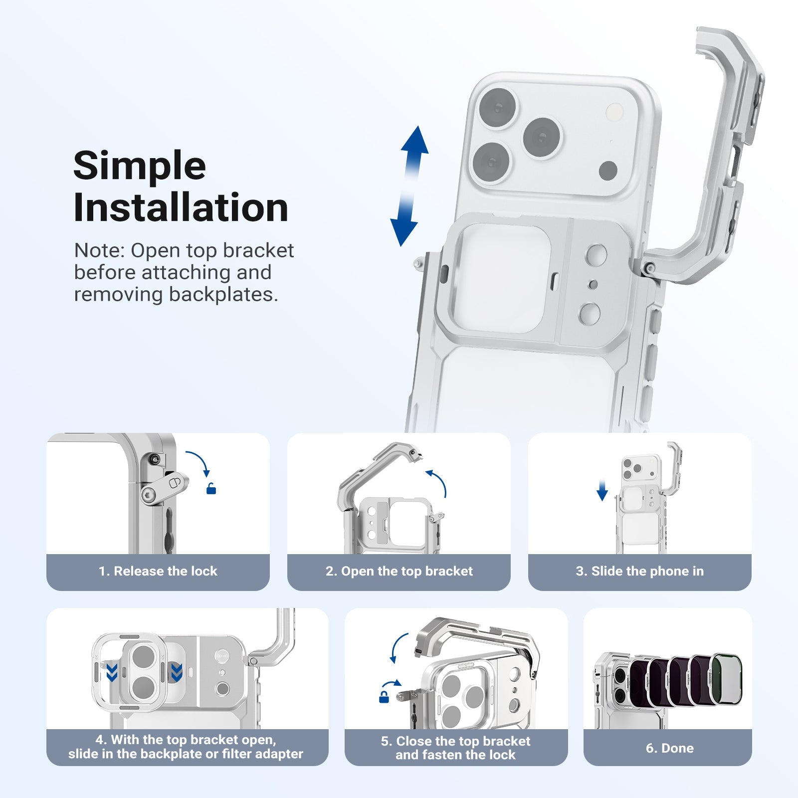 - Diseño magnético apilable : Desliza la placa posterior del filtro sobre la carcasa del teléfono hasta que quede fija y luego fija los filtros con imanes. Apila varios filtros para crear efectos creativos. Nota: Abre el soporte superior de la carcasa antes de instalar la placa posterior.