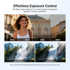 - Control de exposición sin esfuerzo : los filtros ND reducen la luz en 3, 4, 5 y 6 pasos para equilibrar la exposición en diversas condiciones, lo que permite capturar movimientos con desenfoque de movimiento. Nota: Use aplicaciones profesionales (como Blackmagic Camera) para evitar el restablecimiento automático de la exposición.