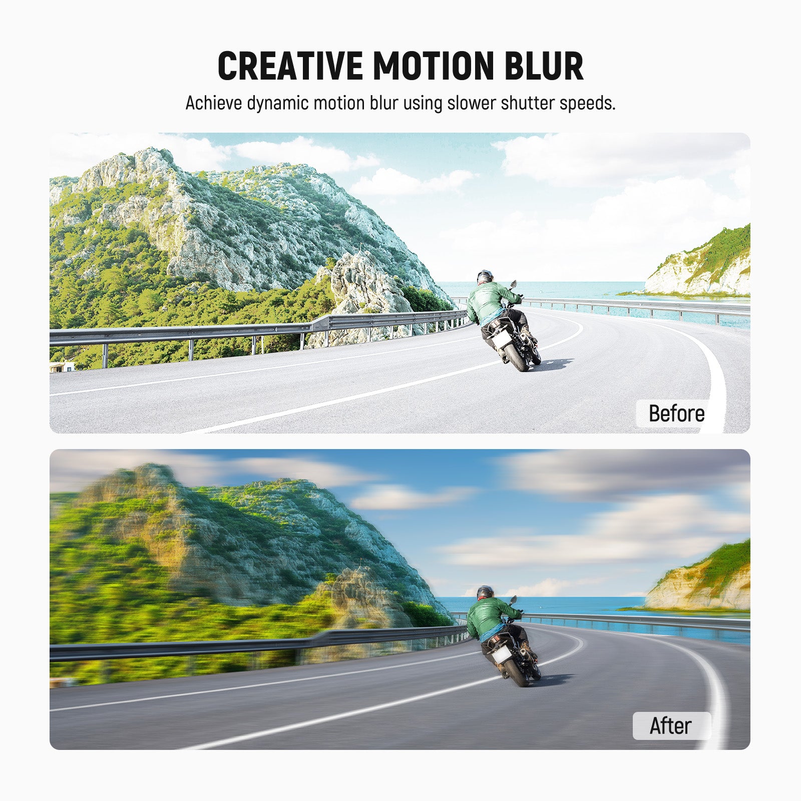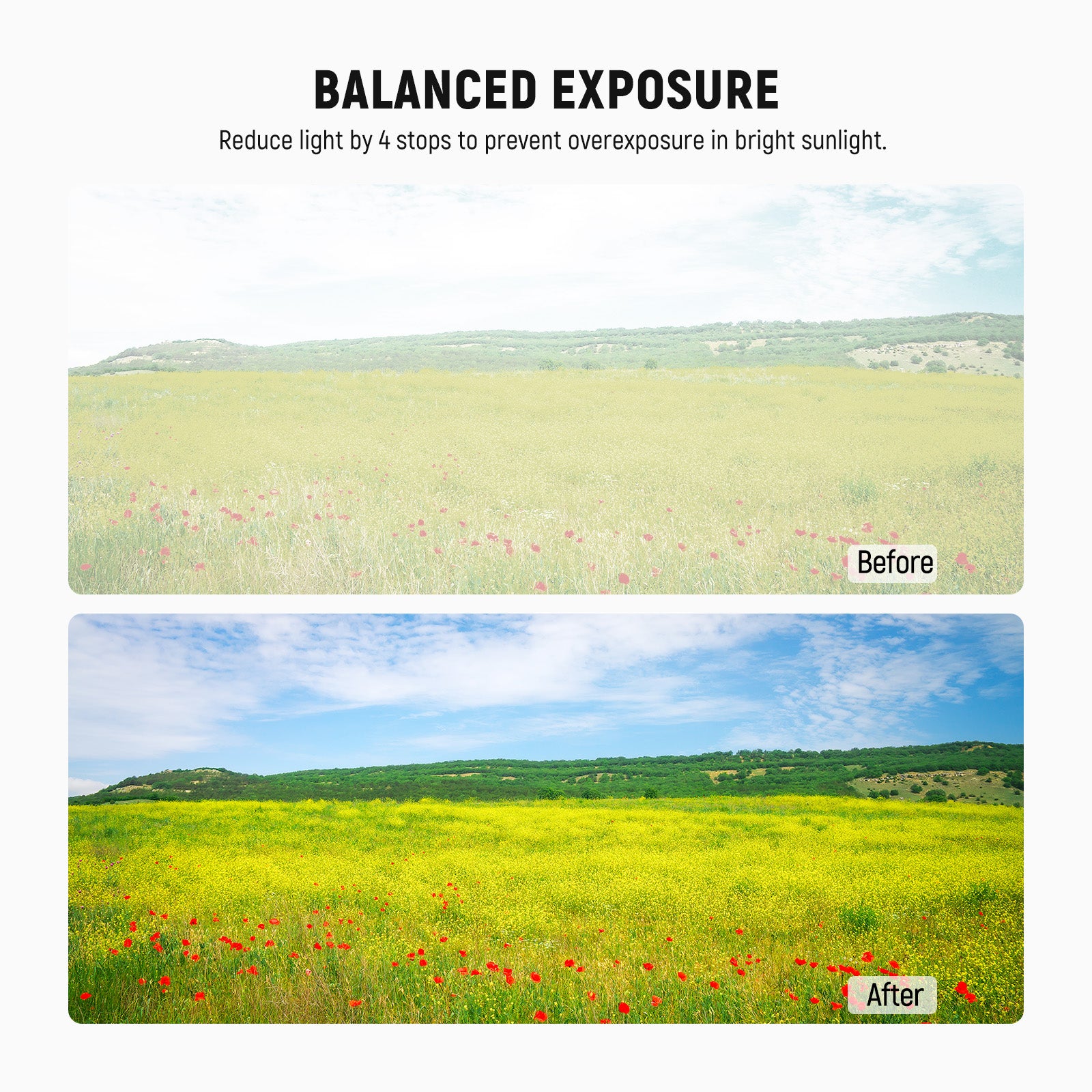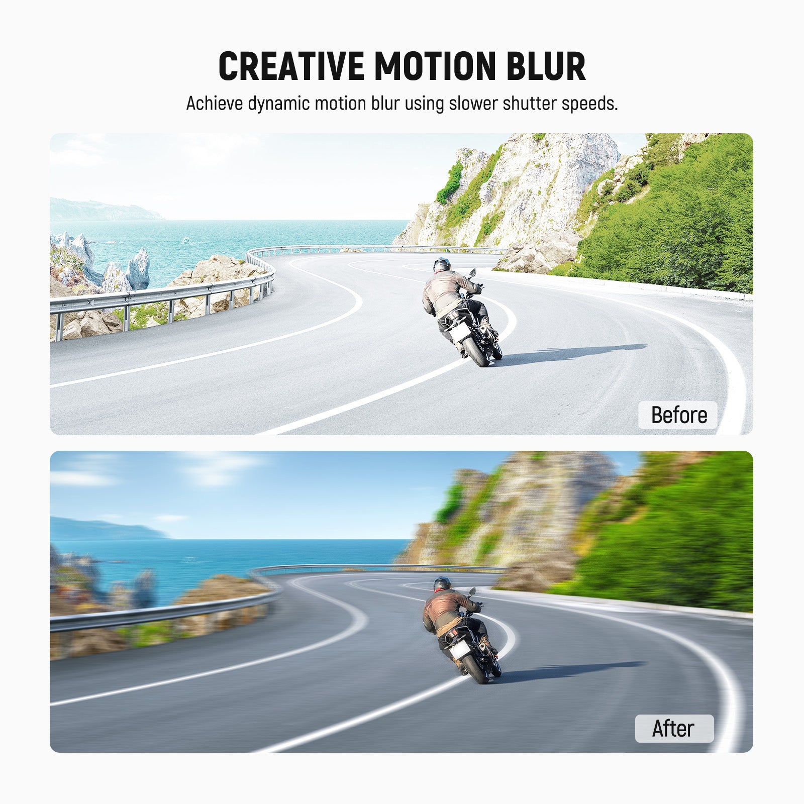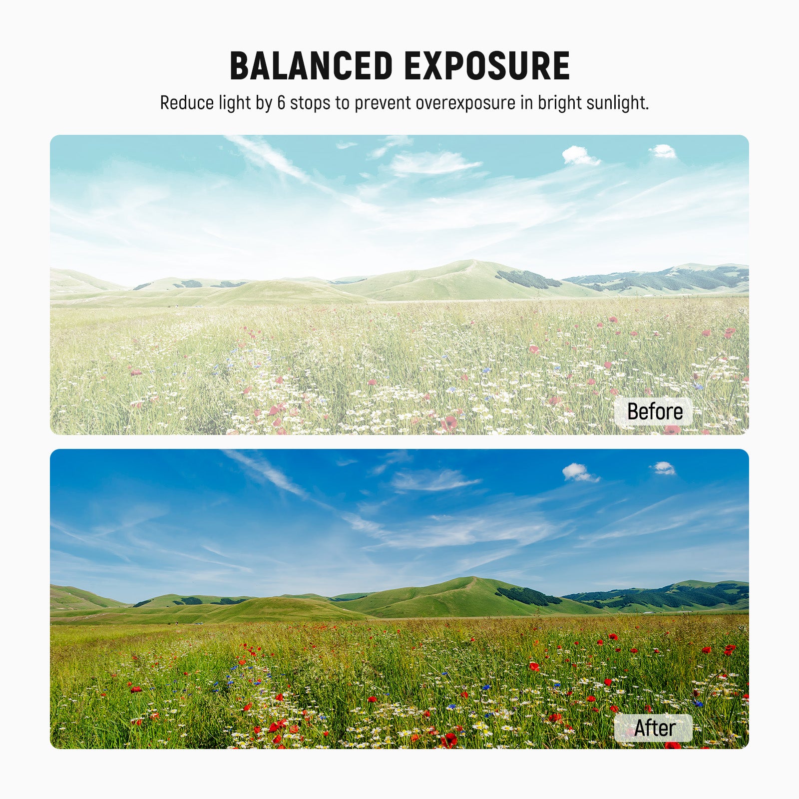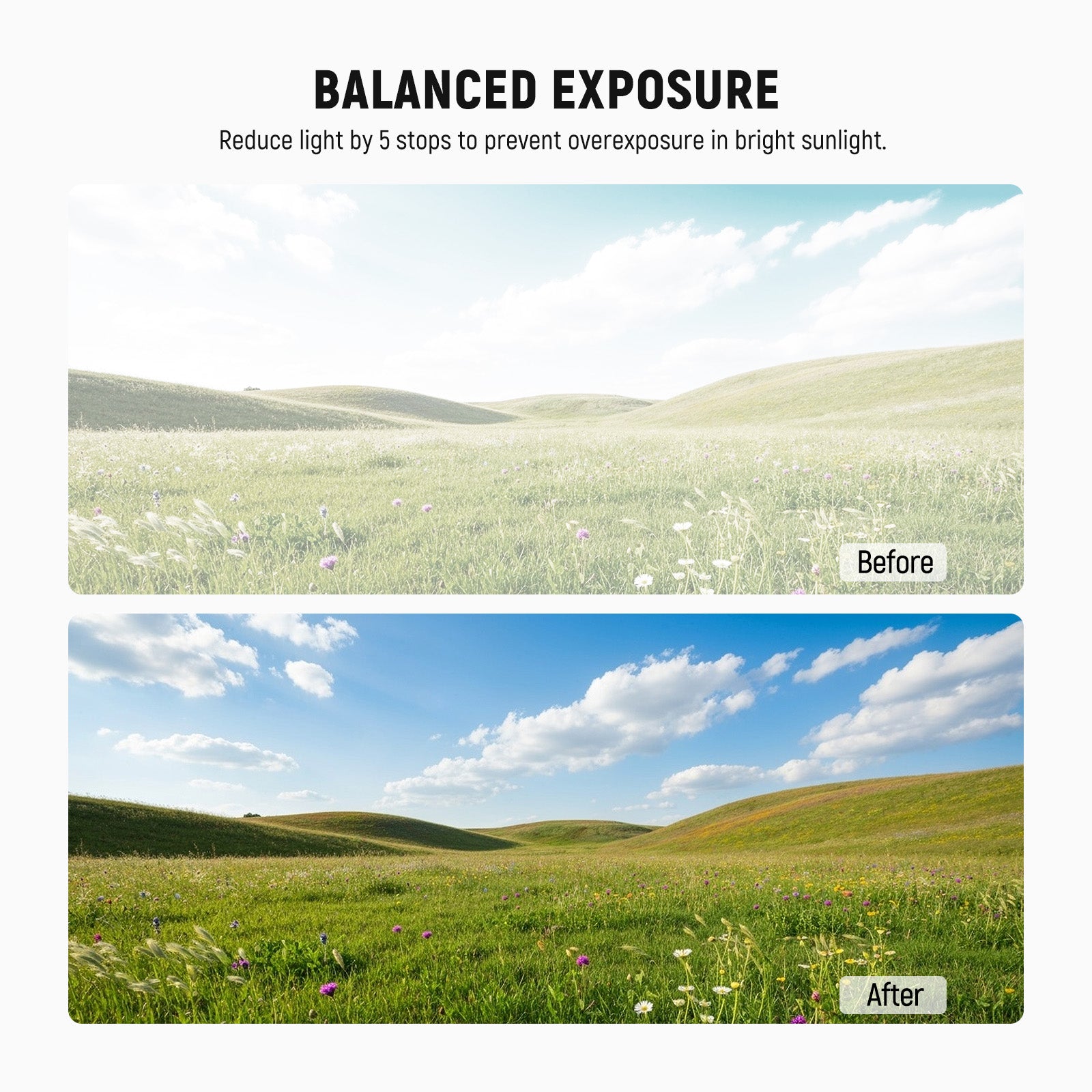 • Exposición exterior equilibrada : los filtros de lente de cámara de densidad neutra ND16 reducen la luz en 4 pasos para evitar la sobreexposición en condiciones brillantes y capturar ríos, cascadas y estelas de luz con un desenfoque de movimiento suave.