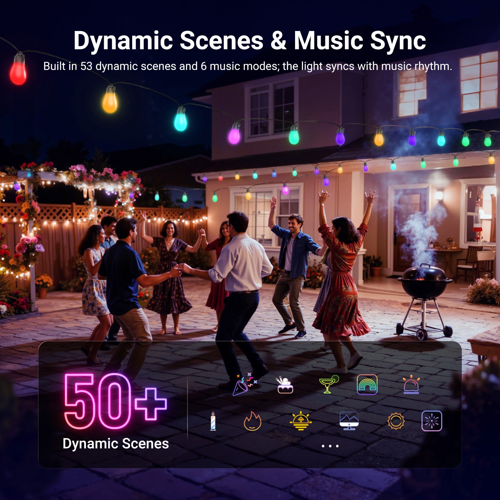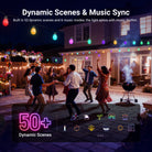 - Escenas dinámicas y modo DIY : Con más de 50 escenas predefinidas que incluyen vida cotidiana, festividades, emociones y naturaleza, y actualizaciones continuas para más efectos, nuestras luces decorativas impermeables para exteriores con bombillas inteligentes que cambian de color también se pueden personalizar mediante la app. Son ideales para el balcón o el patio. Iluminación enchufable para Navidad, Halloween, Acción de Gracias, Pascua, cumpleaños, decoración de toldos de tiendas de campaña o autocaravanas, fiestas en dormitorios, bodas en el jardín, mercados, etc.
