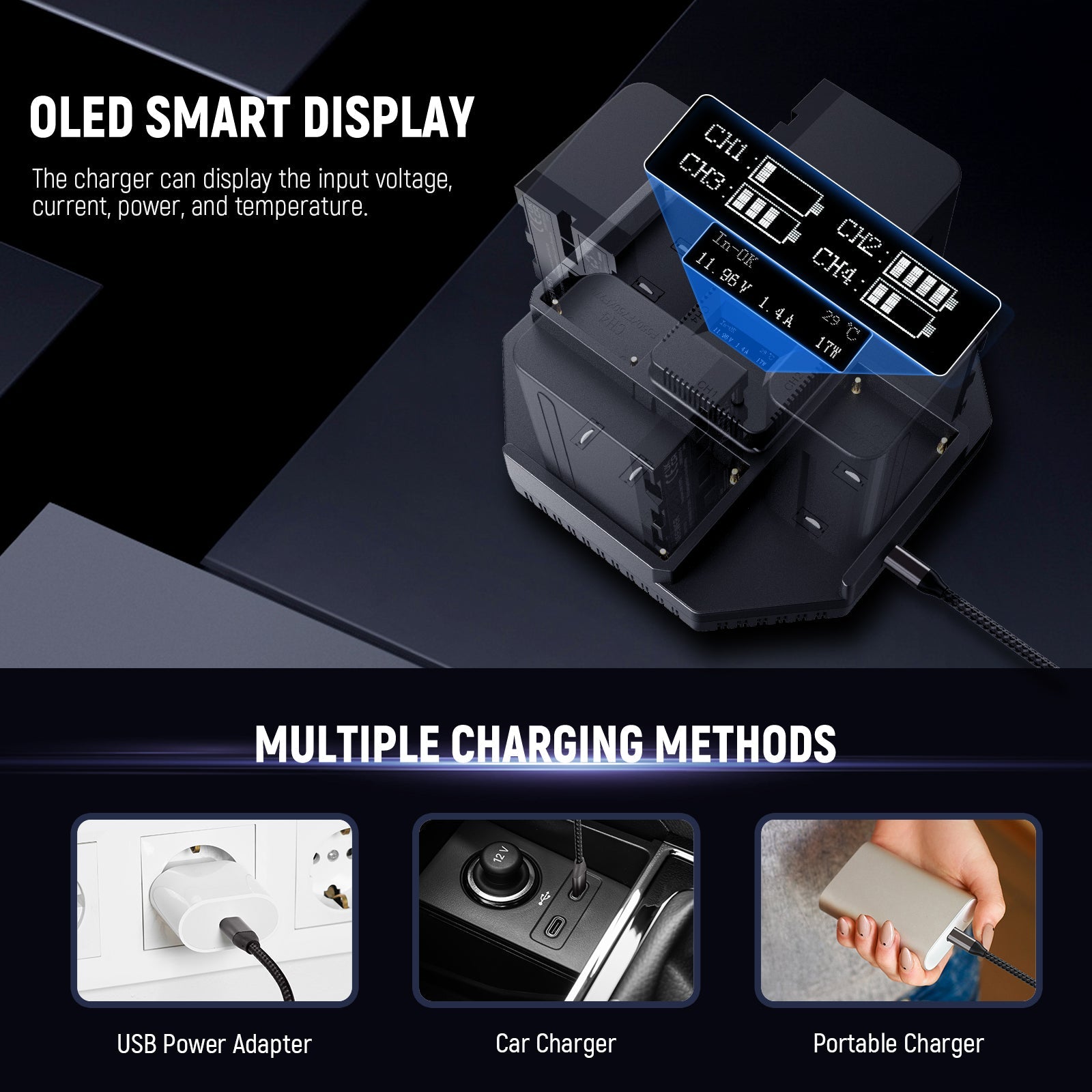- Diseños de protección integral : cada ranura del cargador de batería NPF está diseñada con precisión para garantizar un ajuste perfecto con la batería cargada, con un circuito avanzado integrado con protección contra sobrecorriente, lo que garantiza una carga segura. Todos los lados están equipados con orificios de ventilación precisos para evitar el sobrecalentamiento durante la carga, y un ventilador incorporado se encenderá automáticamente cuando la temperatura de carga supere los 122 ℉/50 ℃.