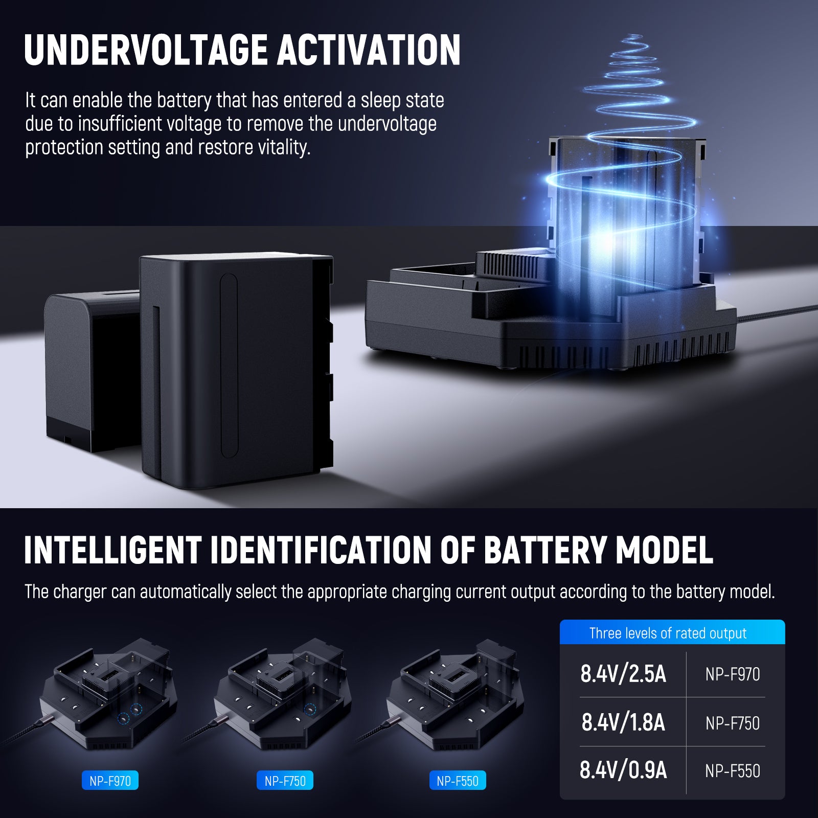 - Totalmente compatible con baterías de la serie NP-F de Sony : el cargador NP-F se adapta perfectamente a las baterías de las series NP-F550, NP-F750 y NP-F970, y cada canal cuenta con 3 niveles de salida nominal: 8,4 V/0,9 A, 8,4 V/1,8 A, 8,4 V/2,5 A. Con un interruptor de detección de corriente, cambia automáticamente entre los tres niveles de salida según el modelo de batería específico, logrando una eficiencia de carga óptima