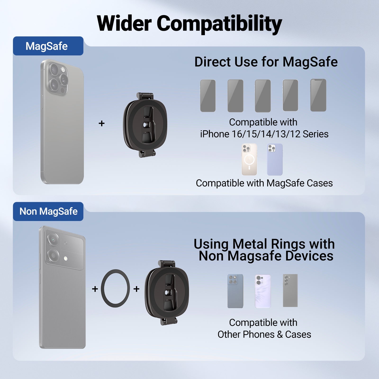 - Ultradelgado y portátil : con un grosor de 9 mm, el soporte magnético para teléfono se pliega y se guarda en la parte posterior del teléfono, y está hecho de aleación de aluminio para mayor ligereza y durabilidad, ideal para selfies, transmisión en vivo o grabación de video.