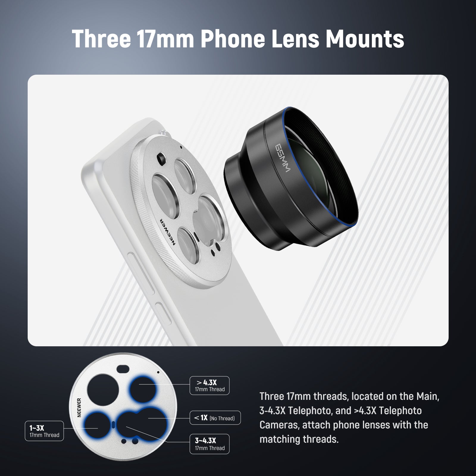- Perfect for NEEWER Phone Lenses- Choose from our diverse phone lens series for your everyday content creation, including 105mm macro, 10x macro, 8mm fisheye, 45x microscope with LED light, 7x telephoto, 60mm telephoto, 18mm wide angle, 1.55x blue anamorphic, and other NEEWER phone attachment lenses with 17mm threads (all sold separately)