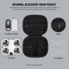 - Bolsillo de malla interno para accesorios : un bolsillo de malla interno con cierre puede almacenar baterías y hélices de repuesto, cables y manuales de usuario. Nota: El bolsillo de malla no se adapta al control remoto NC-R3