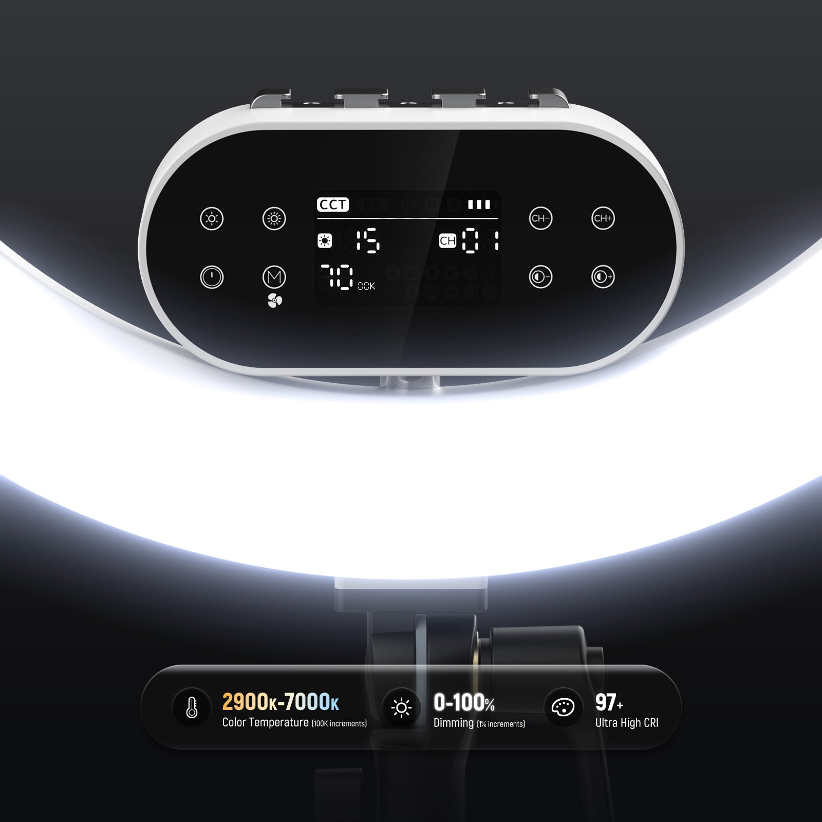- Modos de efectos de escena CCT y FX : El modo CCT ofrece un rango ajustable de 2900K a 7000K para tonos cálidos y fríos, además de atenuación de 0 a 100% para adaptarse a diversas necesidades de iluminación y un CRI97+ de alta precisión de color. El ajuste flexible de la iluminación favorece todos los tonos de piel, ilumina el rostro y minimiza las imperfecciones. El modo FX ofrece 12 efectos de escena realistas para grabar videos profesionales. Usa el controlador con cable para obtener rápidamente los efectos que deseas.