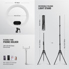 - Práctico control táctil y control remoto Bluetooth : Con una interfaz táctil, el gran anillo de luz de halo vertical permite ajustar fácilmente la iluminación con un simple toque, ofreciendo una experiencia de control intuitiva y eficiente. La pantalla de alta resolución muestra intuitivamente el estado y los parámetros en tiempo real, manteniendo a los usuarios informados en todo momento. Incluye un control remoto Bluetooth para controlar fácilmente la luz durante la toma sin necesidad de tocar el panel ni la pantalla del teléfono.