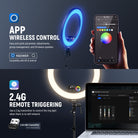 - Modos CCT/HSI/RGBCW/GEL/FX : Cinco modos: CCT (2500K–10000K), HSI, RGBCW, GEL y FX (18 efectos de escena, incluyendo el efecto "Música" con respuesta de sonido). Este kit de aro de luz con soporte para teléfono ofrece una iluminación circular de halo versátil y fiable como luz principal o de relleno para transmisiones en vivo, podcasts, sesiones de fotos en estudio, selfies, maquillaje, tatuajes, peluquerías, esteticistas, salones de belleza, grabación de video, filmación, vlogs de TikTok y más.