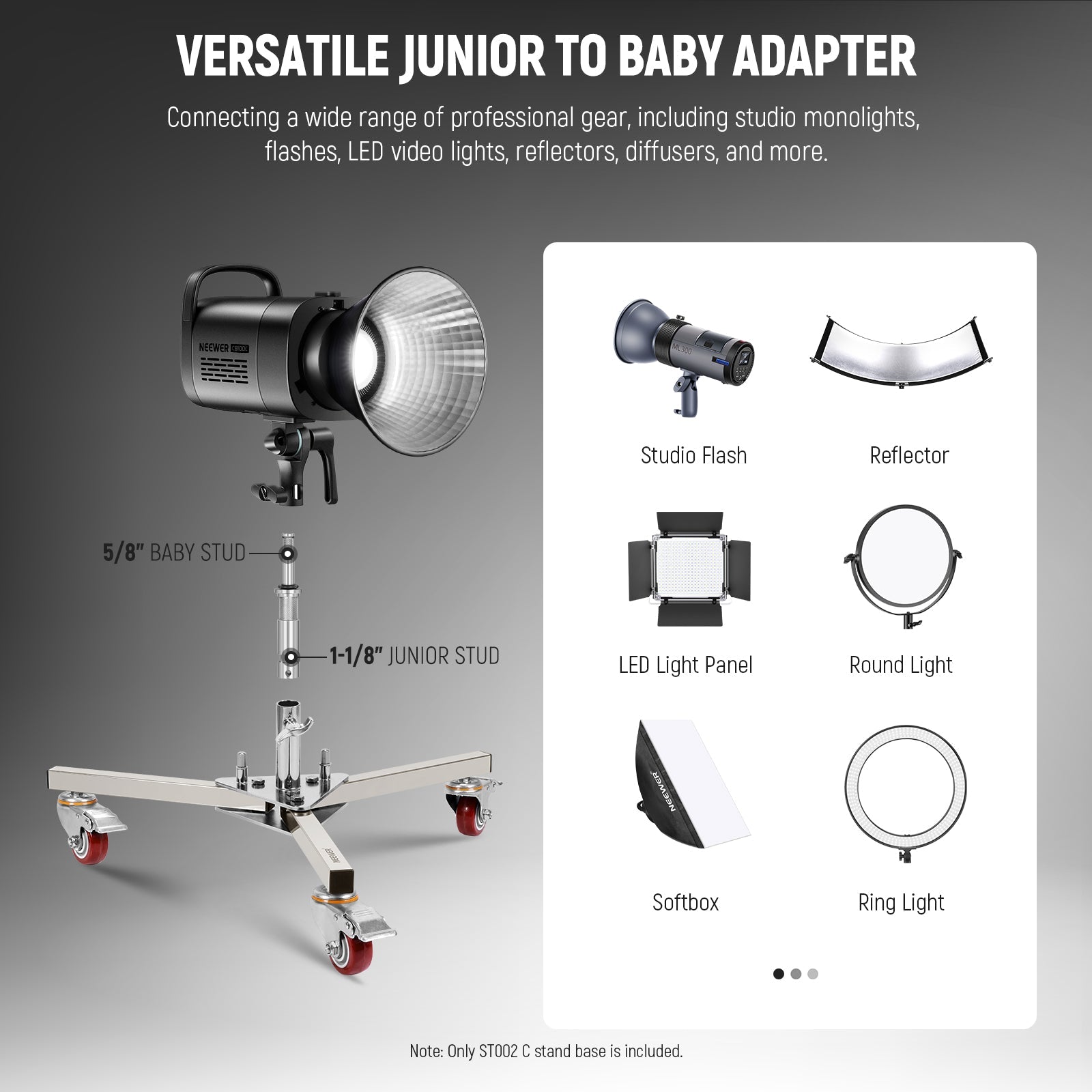 - Adaptador versátil de Junior a Baby : nuestra base de soporte de disparo de ángulo bajo está equipada con un adaptador de 1-1/8" Junior a 5/8" Baby, compatible con columnas centrales de soporte C de 1-1/8" (28 mm), que conecta una amplia gama de equipos profesionales, incluidos monolights de estudio, flashes, luces de video LED, reflectores, difusores y más