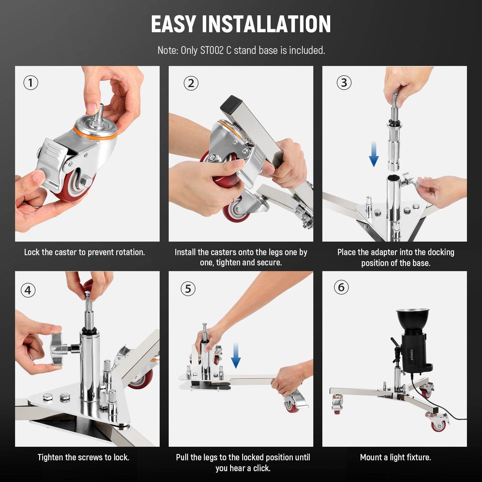 - Base de soporte con ruedas grande y estable de 30"/75 cm : esta base de soporte de luz para fotografía de alta resistencia tiene un diámetro de huella grande de 30"/75 cm para garantizar la máxima estabilidad en el piso. El diseño de un pasador de acero bloquea las patas de forma segura, lo que evita que se doblen accidentalmente durante el uso y garantiza un rendimiento constante.