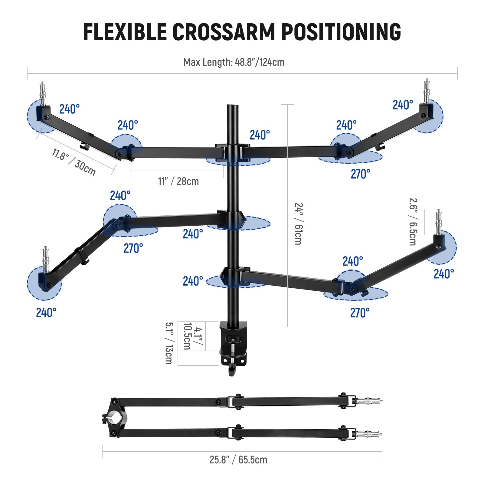 - Brazos flexibles y desmontables : los brazos para cámara y micrófono te dan la libertad de personalizar tu configuración y lograr la mejor experiencia de grabación o transmisión. La unión entre la columna central y el brazo puede girar 240°. El brazo en sí puede girar 270° e inclinarse 240°, y los tornillos de los extremos también pueden inclinarse 240°. Todos los brazos son desmontables para que puedas adaptar la configuración a tus necesidades específicas.