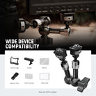 - Brazo mágico articulado flexible y estable : con dos brazos articulados conectados por una junta de engranaje de fricción de 360°, este soporte para cámara con brazo mágico de roseta de 7"/18 cm con dos cabezales esféricos ofrece un posicionamiento versátil para cámaras DSLR sin espejo, paneles de luz de video LED, micrófonos y equipos de campo. monitores (compatibles con Atomos Ninja V), soportes para teléfonos, adaptadores para cámaras de acción, etc., y los conecta a jaulas para cámaras, trípodes para cámaras u otros equipos para cámaras mediante una súper abrazadera (no incluida).