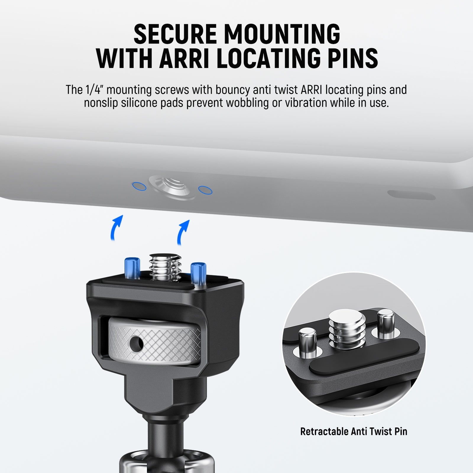 - Montaje seguro con pasadores de localización ARRI : los tornillos de montaje de 1/4" con pasadores de localización ARRI retráctiles antigiro y almohadillas de silicona antideslizantes evitan el tambaleo o la vibración mientras están en uso. Los tornillos de mariposa se pueden apretar a mano para una instalación sin herramientas.